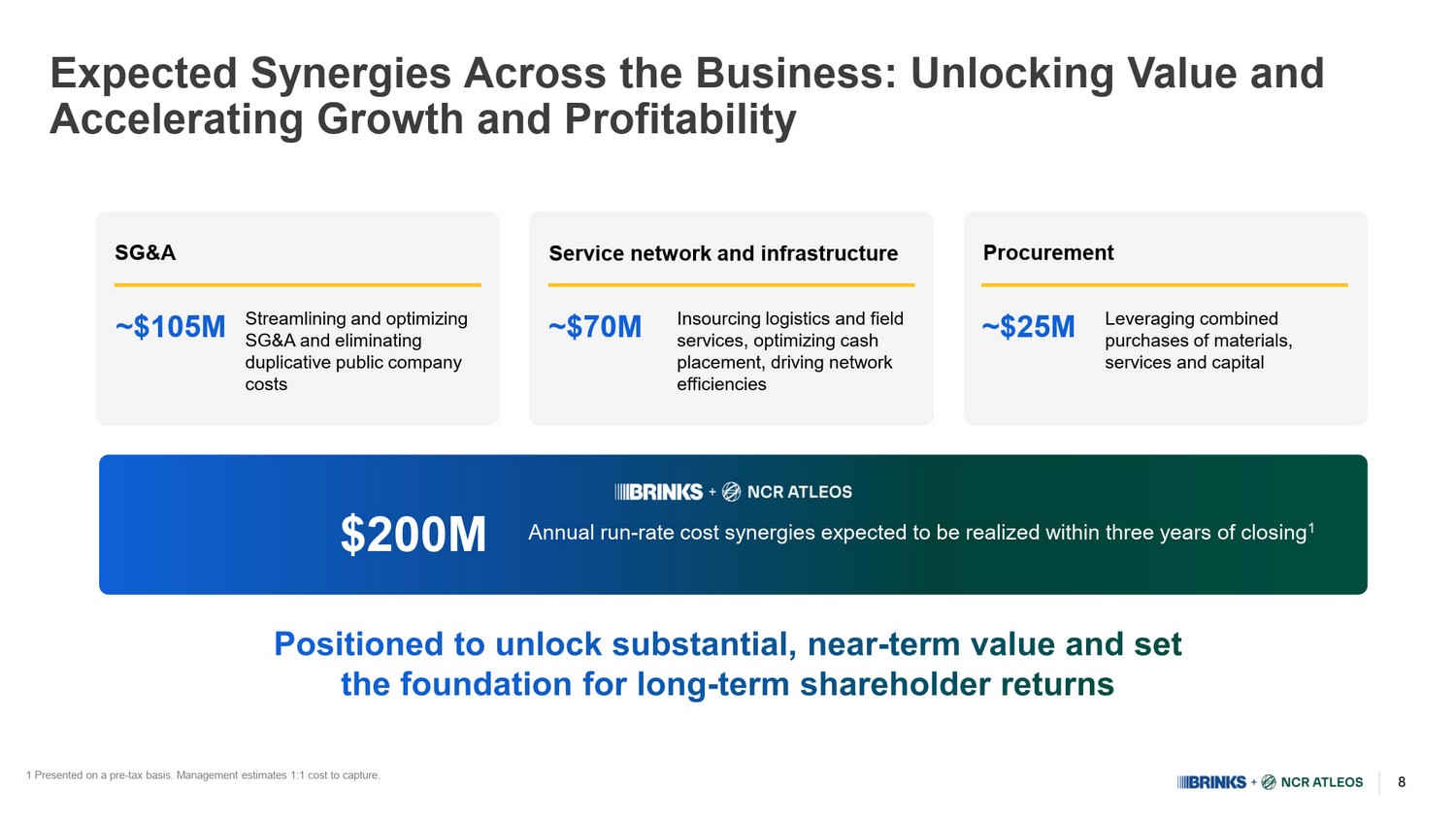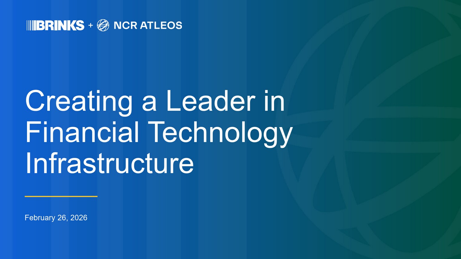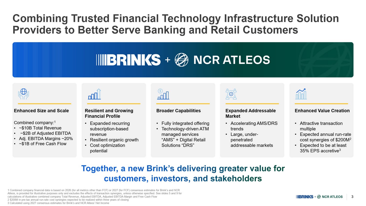 2 Cautionary Note Regarding Forward - Looking Statements This presentation contains forward - looking statements within the meaning of the Private Securities Litigation Reform Act of 1995 . Words such as “anticipate,” “assume,” “could,” “estimate,” “expect,” “target,” “possible,” “project,” “predict,” “intend,” “pl an,” “believe,” “potential,” “may,” “should”, “will” and similar expressions are based on current expectations and assumptions and are subject to risks, uncertainties and contingencies, many of which are beyond our control and difficult to pre dict or quantify, and which could cause actual results to differ materially from those that are anticipated. Factors that could cause actual results to differ include, but are not limited to: Brink’s ability to consummate the proposed tr ansaction with NCR Atleos (the “ Transaction ”); the occurrence of any event, change or other circumstance that could give rise to the termination of the definitive agree men t; Brink’s ability to finance the Transaction; Brink’s indebtedness, including the substantial indebtedness Brink’s will incur in connection with the Transaction and the need to generate suffici ent cash flows to service and repay such debt; failure to consummate any anticipated repayment of the combined company’s indebted ne ss or make any returns to shareholders in the expected timeframe or at all; failure to obtain applicable regulatory or shareholder approvals in a timely manner or otherwise; failure to satisfy any other conditions to closing of the Transacti on; failure to realize the anticipated benefits and synergies of the Transaction in the expected timeframe or at all, including a s a result of a delay in consummating the Transaction; the success of integration plans and the time required to successfully integrate NCR Atleos ’ operations with those of Brink’s; the focus of management’s time and attention on the Transaction and other potential disru pti ons arising from the Transaction; the effects of the announcement of the Transaction on Brink’s or NCR Atleos ’ businesses; that operating costs, customer loss and business disruption (including, without limitation, difficulties in maintaining relationships with banks, employees, customers or suppliers) may be greater than expected followi ng the public announcement of the Transaction; Brink’s or NCR Atleos ’ ability to retain certain key employees following the public announcement of the Transaction; the potential for litigation rel ated to the Transaction; Brink’s or NCR Atleos ’ ability to obtain certain third party or governmental regulatory consents, approvals or clearances; potential undisclosed lia bil ities of NCR Atleos not identified during the due diligence process; the impact of the Transaction on the market price of Brink’s or NCR Atleos ’ common stock and/or operating results; and general economic conditions that are less favorable than expected. Additional information concerning other risk factors is also contained in Part I, Item 1A “Risk Factors” of ( i ) Brink’s Annual Report on Form 10 - K for the year ended December 31, 2025, filed with the Securities and Exchange Commission (th e “ SEC ”) on February 26, 2026, and (ii) NCR Atleos ’ Annual Report on Form 10 - K for the year ended December 31, 2025, filed with the SEC on February 26, 2026 and, in each case, in subsequent filings with the SEC. The forward - looking information included in this presentation is representative only as of the date of this document and Brink’s and NCR Atleos undertake no obligation to update, revise or clarify any information contained in this document or forward - looking statements t hat may be made from time to time on either of their behalf, whether as a result of new information, future events or otherwise, except as required by law. Additional Information and Where to Find It In connection with the Transaction, Brink’s will file with the SEC a registration statement on Form S - 4 (the “ Registration Statement ”), which will include ( i ) a preliminary joint proxy statement of both companies, the definitive version of which will separately be sent or provided to Brink’s and NCR Atleos ’ respective shareholders, and (ii) a prospectus of Brink’s relating to the offer of Brink’s securities to be issued to NCR Atleos ’ shareholders in connection with the completion of the Transaction. Brink’s and NCR Atleos may also file other documents with the SEC regarding the Transaction. This document is not a substitute for the Registration St atement, the preliminary proxy statement/prospectus or any other document which Brink’s or NCR Atleos may file with the SEC. INVESTORS AND SECURITY HOLDERS ARE URGED TO READ THE PRELIMINARY PROXY STATEMENT/PROSPECTUS AND ANY OTHER RELEVANT DOCUMENTS THA T ARE FILED OR WILL BE FILED WITH THE SEC, AS WELL AS ANY AMENDMENTS OR SUPPLEMENTS TO THESE DOCUMENTS, CAREFULLY AND IN THEIR ENTIRETY BECAUSE THEY CONTAIN OR WILL CONTAIN IMPORTANT INFORMATION AB OUT THE TRANSACTION AND RELATED MATTERS. Investors and security holders may obtain free copies of the preliminary proxy statement/prospectus (when it is available) an d o ther documents that are filed with the SEC or will be filed with the SEC by Brink’s or NCR Atleos (when they become available) through the website maintained by the SEC at http://www.sec.gov or from Brink’s at its website, https://us.brinks.com/ or from NCR Atleos at its website, https://investor.ncratleos.com/. Participants in the Solicitation Brink’s, NCR Atleos , and certain of their directors and executive officers may be deemed to be participants in the solicitation of proxies from the shareholders of Brink’s or NCR Atleos in connection with the Transaction under the rules of the SEC. Information about the interests of the directors and executive o fficers of Brink’s and NCR Atleos and other 