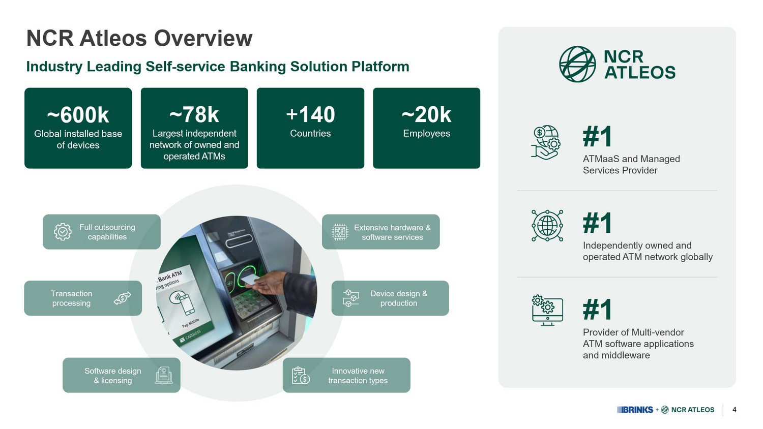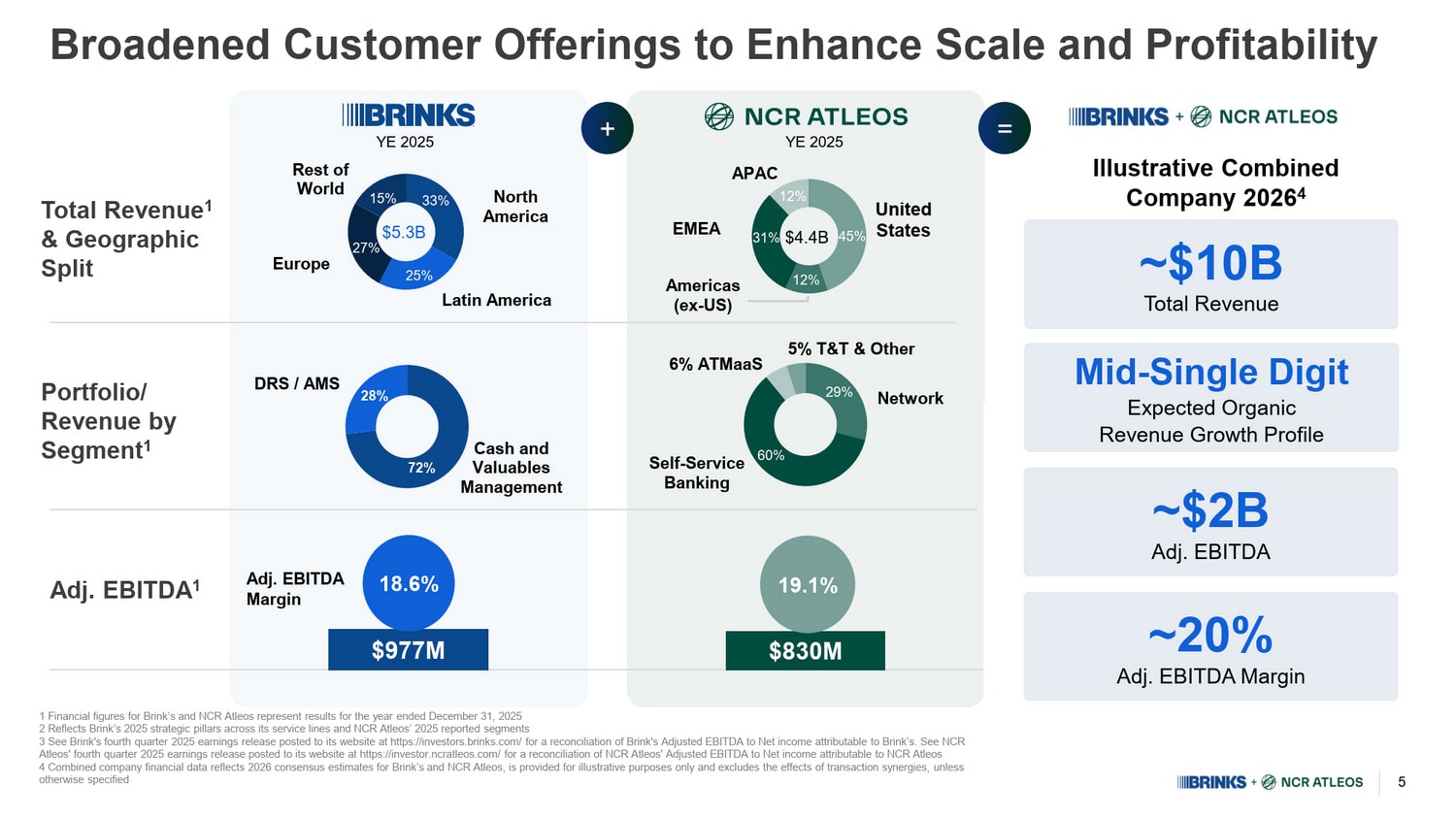 3 Combining Trusted Financial Technology Infrastructure Solution Providers to Better Serve Banking and Retail Customers Enhanced Size and Scale Combined company: 1 • ~$10B Total Revenue • ~$2B of Adjusted EBITDA • Adj. EBITDA Margins ~20% • ~$ 1B of Free Cash Flow Resilient and Growing Financial Profile • Expanded recurring subscription - based revenue • Resilient organic growth • Cost optimization potential Broader Capabilities • Fully integrated offering • Technology - driven ATM managed services “AMS” + Digital Retail Solutions “DRS” Expanded Addressable Market • Accelerating AMS/DRS trends • Large, under - penetrated addressable markets Enhanced Value Creation • Attractive transaction multiple • Expected annual run - rate cost synergies of $200M 2 • Expected to be at least 35% EPS accretive 3 1 Combined company financial data is based on 2026 (for all metrics other than FCF) or 2027 (for FCF) consensus estimates for Br ink’s and NCR Atleos , is provided for illustrative purposes only and excludes the effects of transaction synergies, unless otherwise specified. S ee slides 5 and 9 for calculations of illustrative combined company Total Revenue, Adjusted EBITDA, Adjusted EBITDA Margin and Free Cash Flow 2 $200M in pre - tax annual run - rate cost synergies expected to be realized within three years of closing 3 Calculated using 2027 consensus estimates for Brink’s and NCR Atleos ’ Net Income