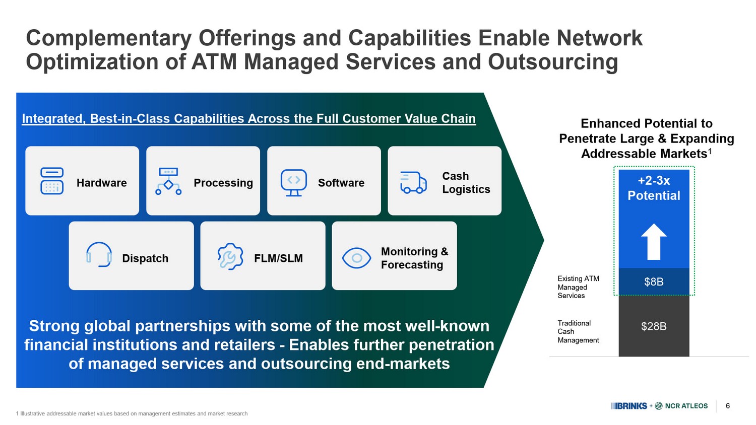 5 Broadened Customer Offerings to Enhance Scale and Profitability 1 Financial figures for Brink’s and NCR Atleos represent results for the year ended December 31, 2025 2 Reflects Brink’s 2025 strategic pillars across its service lines and NCR Atleos ’ 2025 reported segments 3 See Brink's fourth quarter 2025 earnings release posted to its website at https://investors.brinks.com/ for a reconciliatio n o f Brink's Adjusted EBITDA to Net income attributable to Brink’s. See NCR Atleos ' fourth quarter 2025 earnings release posted to its website at https://investor.ncratleos.com/ for a reconciliation of NCR A tle os' Adjusted EBITDA to Net income attributable to NCR Atleos 4 Combined company financial data reflects 2026 consensus estimates for Brink’s and NCR Atleos , is provided for illustrative purposes only and excludes the effects of transaction synergies, unless otherwise specified Total Revenue 1 & Geographic Split Portfolio/ Revenue by Segment 1 + = Adj. EBITDA 1 $ 977 M $830M North America Latin America Europe Rest of World 25% 33% 27% 15% $5.3B United States Americas (ex - US) EMEA APAC $4.4B 18.6% Adj. EBITDA Margin Cash and Valuables Management DRS / AMS 28% 72% Network Self - Service Banking 5% T&T & Other 29% 60% 6% ATMaaS 19.1% 45% 31% 12% 12% ~$10B Total Revenue Illustrative Combined Company 2026 4 YE 2025 YE 2025 ~$2B Adj. EBITDA Mid - Single Digit Expected Organic Revenue Growth Profile ~20% Adj. EBITDA Margin