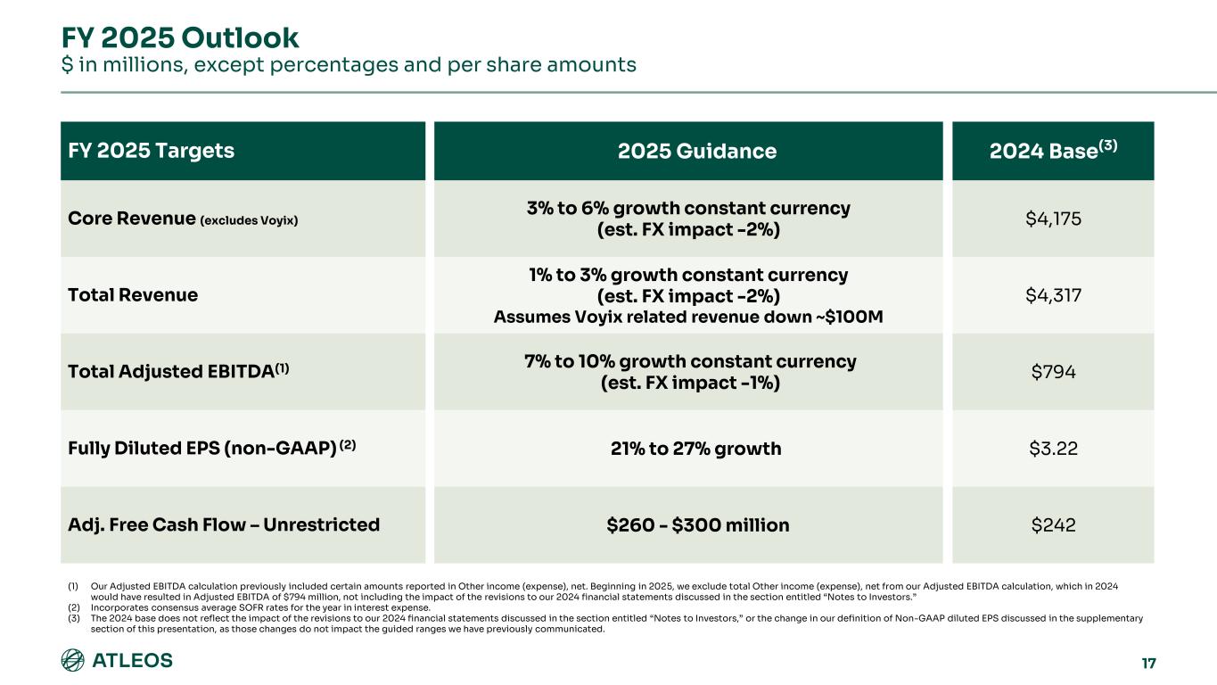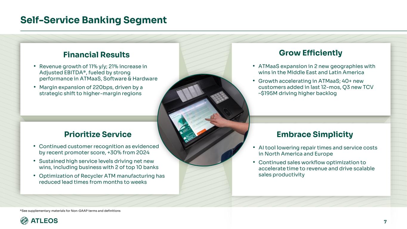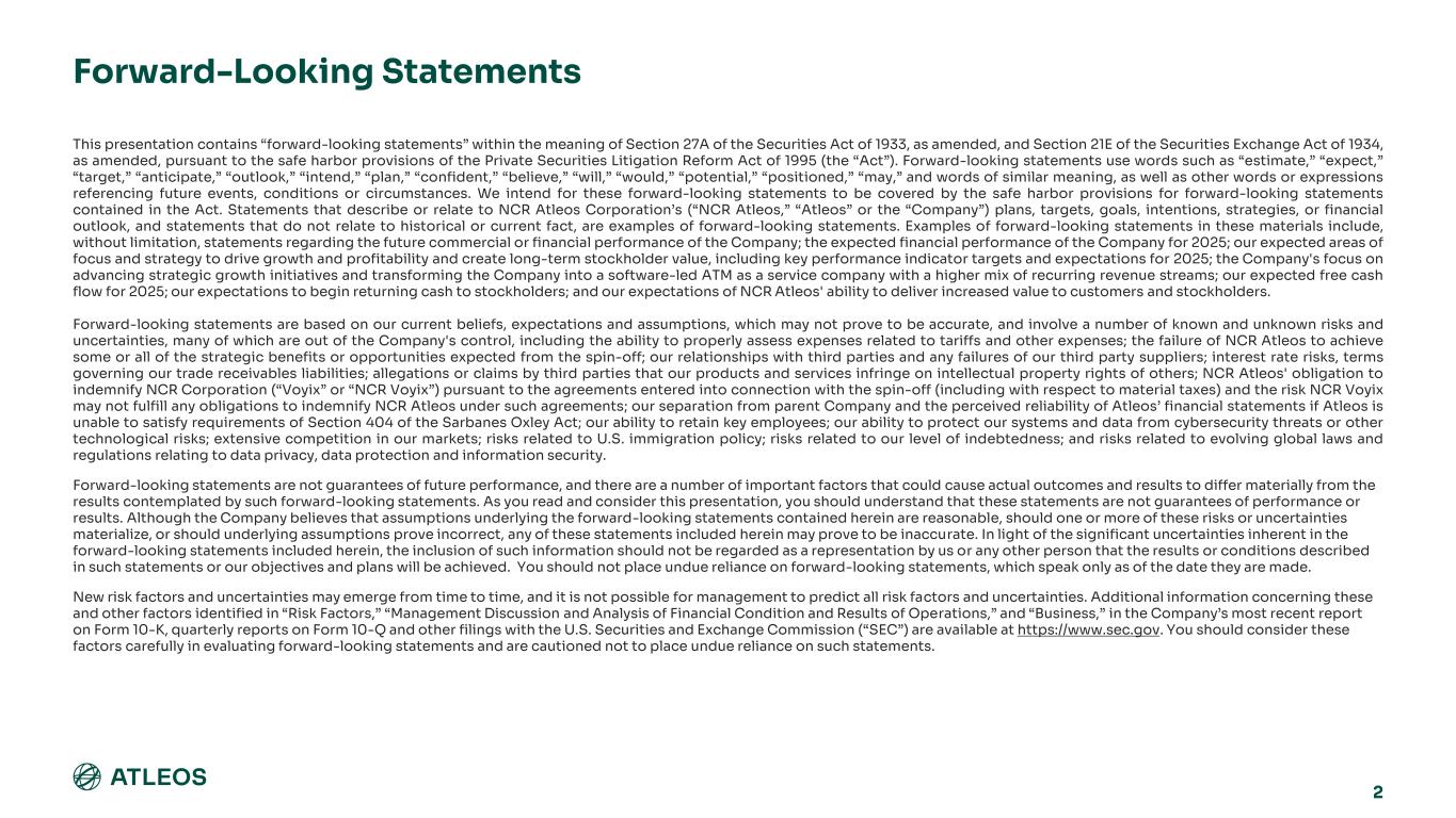 2 This presentation contains “forward-looking statements” within the meaning of Section 27A of the Securities Act of 1933, as amended, and Section 21E of the Securities Exchange Act of 1934, as amended, pursuant to the safe harbor provisions of the Private Securities Litigation Reform Act of 1995 (the “Act”). Forward-looking statements use words such as “estimate,” “expect,” “target,” “anticipate,” “outlook,” “intend,” “plan,” “confident,” “believe,” “will,” “would,” “potential,” “positioned,” “may,” and words of similar meaning, as well as other words or expressions referencing future events, conditions or circumstances. We intend for these forward-looking statements to be covered by the safe harbor provisions for forward-looking statements contained in the Act. Statements that describe or relate to NCR Atleos Corporation’s (“NCR Atleos,” “Atleos” or the “Company”) plans, targets, goals, intentions, strategies, or financial outlook, and statements that do not relate to historical or current fact, are examples of forward-looking statements. Examples of forward-looking statements in these materials include, without limitation, statements regarding the future commercial or financial performance of the Company; the expected financial performance of the Company for 2025; our expected areas of focus and strategy to drive growth and profitability and create long-term stockholder value, including key performance indicator targets and expectations for 2025; the Company's focus on advancing strategic growth initiatives and transforming the Company into a software-led ATM as a service company with a higher mix of recurring revenue streams; our expected free cash flow for 2025; our expectations to begin returning cash to stockholders; and our expectations of NCR Atleos' ability to deliver increased value to customers and stockholders. Forward-looking statements are based on our current beliefs, expectations and assumptions, which may not prove to be accurate, and involve a number of known and unknown risks and uncertainties, many of which are out of the Company's control, including the ability to properly assess expenses related to tariffs and other expenses; the failure of NCR Atleos to achieve some or all of the strategic benefits or opportunities expected from the spin-off; our relationships with third parties and any failures of our third party suppliers; interest rate risks, terms governing our trade receivables liabilities; allegations or claims by third parties that our products and services infringe on intellectual property rights of others; NCR Atleos' obligation to indemnify NCR Corporation (“Voyix” or “NCR Voyix”) pursuant to the agreements entered into connection with the spin-off (including with respect to material taxes) and the risk NCR Voyix may not fulfill any obligations to indemnify NCR Atleos under such agreements; our separation from parent Company and the perceived reliability of Atleos’ financial statements if Atleos is unable to satisfy requirements of Section 404 of the Sarbanes Oxley Act; our ability to retain key employees; our ability to protect our systems and data from cybersecurity threats or other technological risks; extensive competition in our markets; risks related to U.S. immigration policy; risks related to our level of indebtedness; and risks related to evolving global laws and regulations relating to data privacy, data protection and information security. Forward-looking statements are not guarantees of future performance, and there are a number of important factors that could cause actual outcomes and results to differ materially from the results contemplated by such forward-looking statements. As you read and consider this presentation, you should understand that these statements are not guarantees of performance or results. Although the Company believes that assumptions underlying the forward-looking statements contained herein are reasonable, should one or more of these risks or uncertainties materialize, or should underlying assumptions prove incorrect, any of these statements included herein may prove to be inaccurate. In light of the significant uncertainties inherent in the forward-looking statements included herein, the inclusion of such information should not be regarded as a representation by us or any other person that the results or conditions described in such statements or our objectives and plans will be achieved. You should not place undue reliance on forward-looking statements, which speak only as of the date they are made. New risk factors and uncertainties may emerge from time to time, and it is not possible for management to predict all risk factors and uncertainties. Additional information concerning these and other factors identified in “Risk Factors,” “Management Discussion and Analysis of Financial Condition and Results of Operations,” and “Business,” in the Company’s most recent report on Form 10-K, quarterly reports on Form 10-Q and other filings with the U.S. Securities and Exchange Commission (“SEC”) are available at https://www.sec.gov. You should consider these factors carefully in evaluating forward-looking statements and are cautioned not to place undue reliance on such statements. Forward-Looking Statements