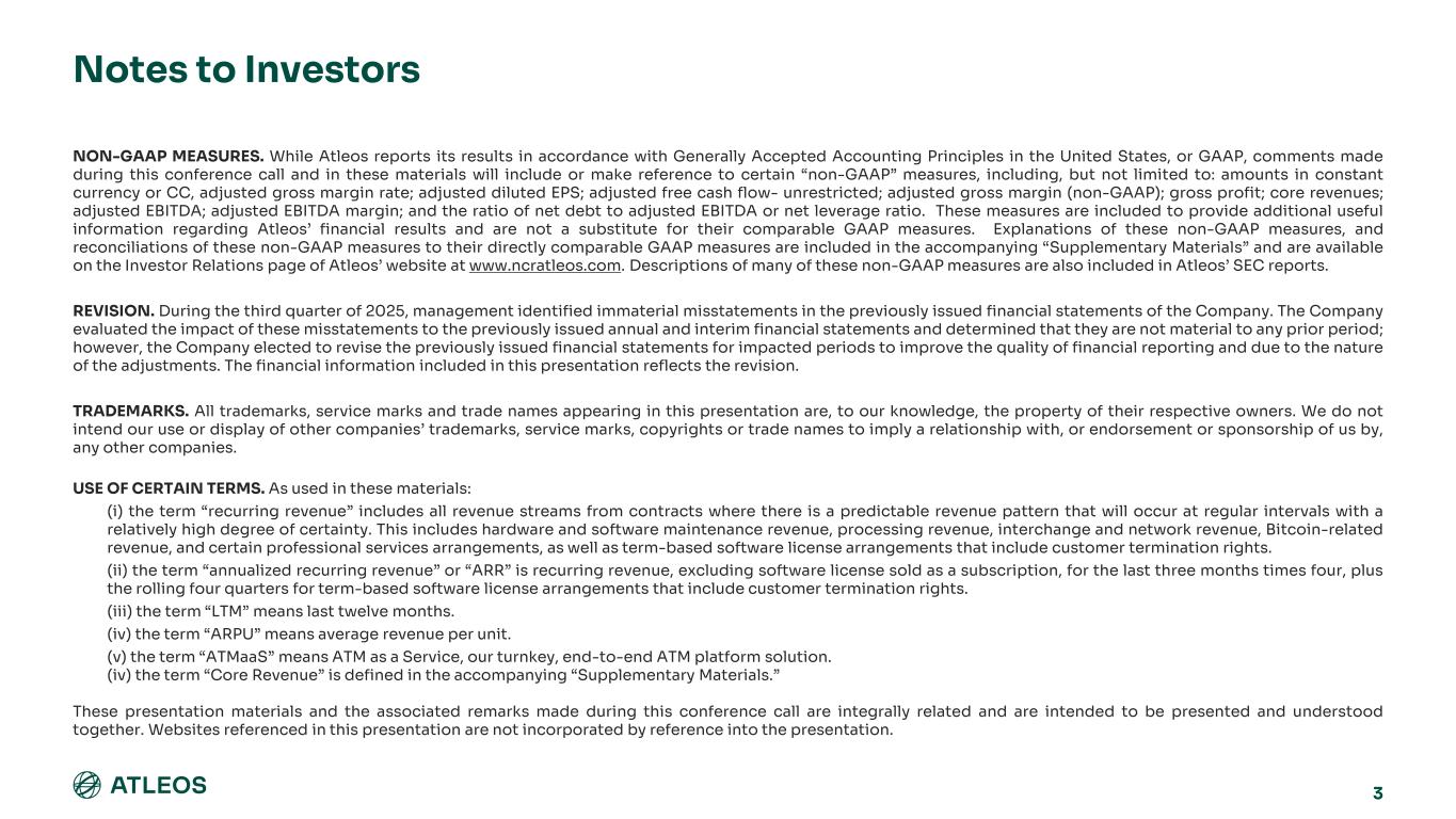3 NON-GAAP MEASURES. While Atleos reports its results in accordance with Generally Accepted Accounting Principles in the United States, or GAAP, comments made during this conference call and in these materials will include or make reference to certain “non-GAAP” measures, including, but not limited to: amounts in constant currency or CC, adjusted gross margin rate; adjusted diluted EPS; adjusted free cash flow- unrestricted; adjusted gross margin (non-GAAP); gross profit; core revenues; adjusted EBITDA; adjusted EBITDA margin; and the ratio of net debt to adjusted EBITDA or net leverage ratio. These measures are included to provide additional useful information regarding Atleos’ financial results and are not a substitute for their comparable GAAP measures. Explanations of these non-GAAP measures, and reconciliations of these non-GAAP measures to their directly comparable GAAP measures are included in the accompanying “Supplementary Materials” and are available on the Investor Relations page of Atleos’ website at www.ncratleos.com. Descriptions of many of these non-GAAP measures are also included in Atleos’ SEC reports. REVISION. During the third quarter of 2025, management identified immaterial misstatements in the previously issued financial statements of the Company. The Company evaluated the impact of these misstatements to the previously issued annual and interim financial statements and determined that they are not material to any prior period; however, the Company elected to revise the previously issued financial statements for impacted periods to improve the quality of financial reporting and due to the nature of the adjustments. The financial information included in this presentation reflects the revision. TRADEMARKS. All trademarks, service marks and trade names appearing in this presentation are, to our knowledge, the property of their respective owners. We do not intend our use or display of other companies’ trademarks, service marks, copyrights or trade names to imply a relationship with, or endorsement or sponsorship of us by, any other companies. USE OF CERTAIN TERMS. As used in these materials: (i) the term “recurring revenue” includes all revenue streams from contracts where there is a predictable revenue pattern that will occur at regular intervals with a relatively high degree of certainty. This includes hardware and software maintenance revenue, processing revenue, interchange and network revenue, Bitcoin-related revenue, and certain professional services arrangements, as well as term-based software license arrangements that include customer termination rights. (ii) the term “annualized recurring revenue” or “ARR” is recurring revenue, excluding software license sold as a subscription, for the last three months times four, plus the rolling four quarters for term-based software license arrangements that include customer termination rights. (iii) the term “LTM” means last twelve months. (iv) the term “ARPU” means average revenue per unit. (v) the term “ATMaaS” means ATM as a Service, our turnkey, end-to-end ATM platform solution. (iv) the term “Core Revenue” is defined in the accompanying “Supplementary Materials.” These presentation materials and the associated remarks made during this conference call are integrally related and are intended to be presented and understood together. Websites referenced in this presentation are not incorporated by reference into the presentation. Notes to Investors