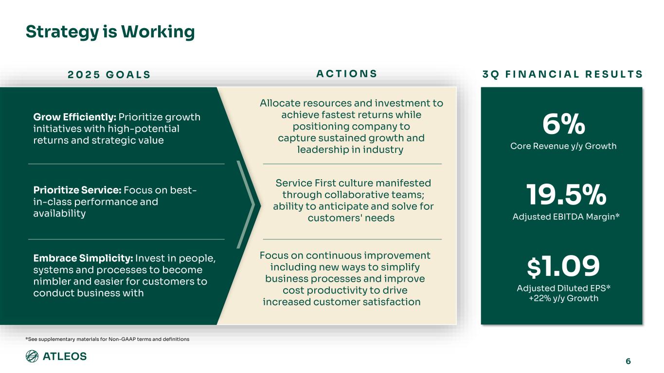 Strategy is Working 2 0 2 5 G O A L S A C T I O N S Allocate resources and investment to achieve fastest returns while positioning company to capture sustained growth and leadership in industry 6 Grow Efficiently: Prioritize growth initiatives with high-potential returns and strategic value Prioritize Service: Focus on best- in-class performance and availability Embrace Simplicity: Invest in people, systems and processes to become nimbler and easier for customers to conduct business with 3 Q F I N A N C I A L R E S U L T S 6% Core Revenue y/y Growth 19.5% Adjusted EBITDA Margin* $1.09 Adjusted Diluted EPS* +22% y/y Growth Focus on continuous improvement including new ways to simplify business processes and improve cost productivity to drive increased customer satisfaction Service First culture manifested through collaborative teams; ability to anticipate and solve for customers' needs *See supplementary materials for Non-GAAP terms and definitions