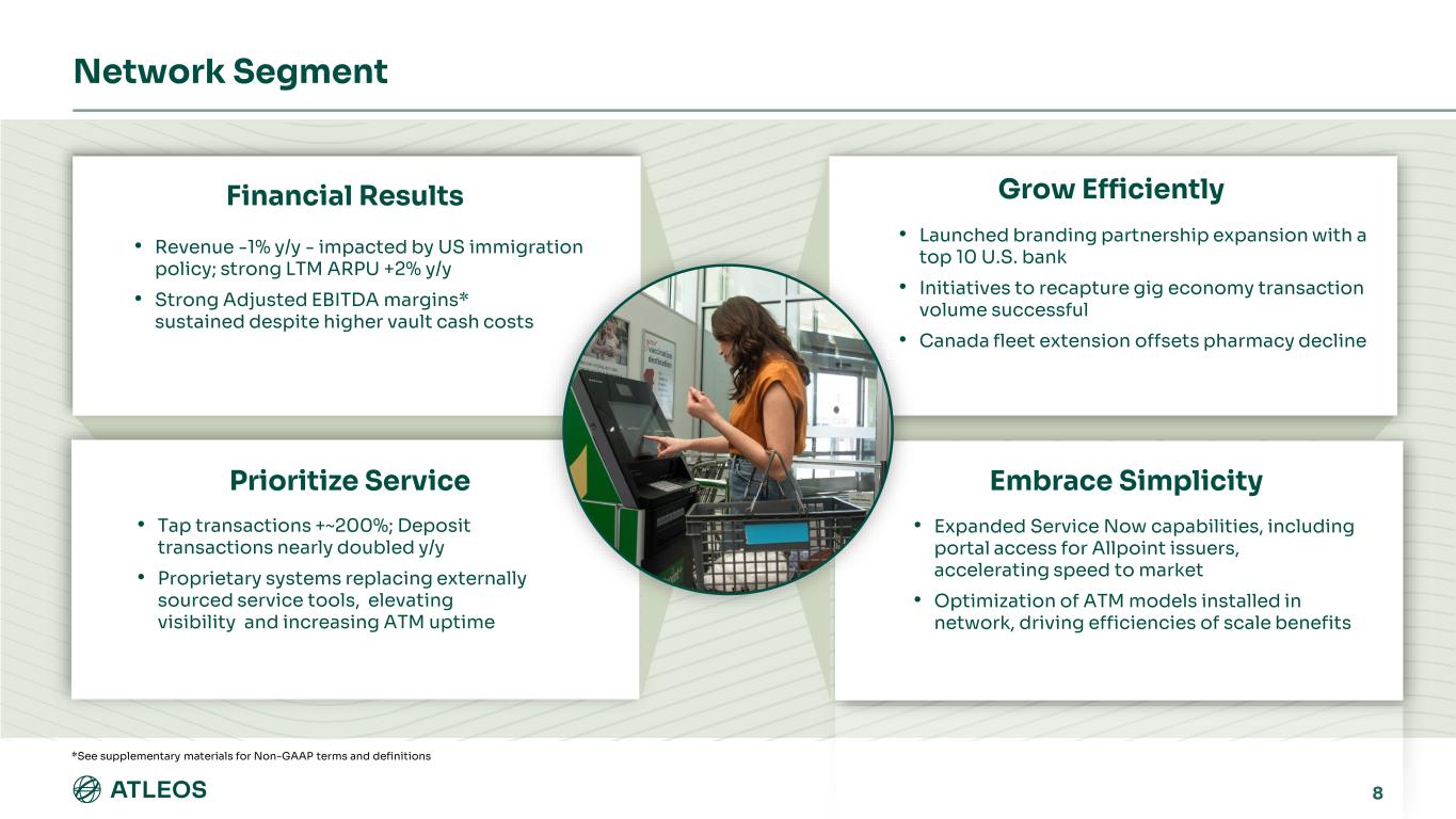 Self-Service Banking Segment 2 7 • ATMaaS expansion in 2 new geographies with wins in the Middle East and Latin America • Growth accelerating in ATMaaS; 40+ new customers added in last 12-mos, Q3 new TCV ~$195M driving higher backlog • Revenue growth of 11% y/y; 21% increase in Adjusted EBITDA*, fueled by strong performance in ATMaaS, Software & Hardware • Margin expansion of 220bps, driven by a strategic shift to higher-margin regions Financial Results Grow Efficiently Prioritize Service Embrace Simplicity • AI tool lowering repair times and service costs in North America and Europe • Continued sales workflow optimization to accelerate time to revenue and drive scalable sales productivity • Continued customer recognition as evidenced by recent promoter score, +30% from 2024 • Sustained high service levels driving net new wins, including business with 2 of top 10 banks • Optimization of Recycler ATM manufacturing has reduced lead times from months to weeks *See supplementary materials for Non-GAAP terms and definitions