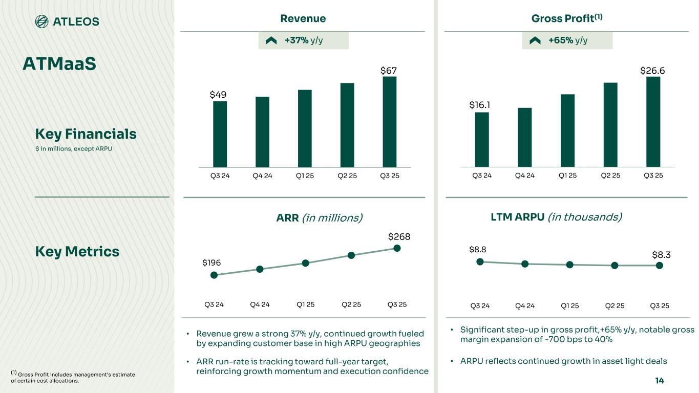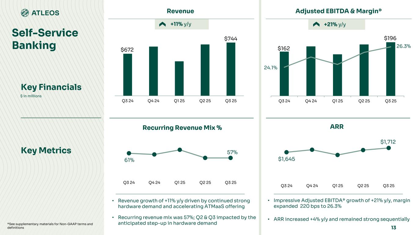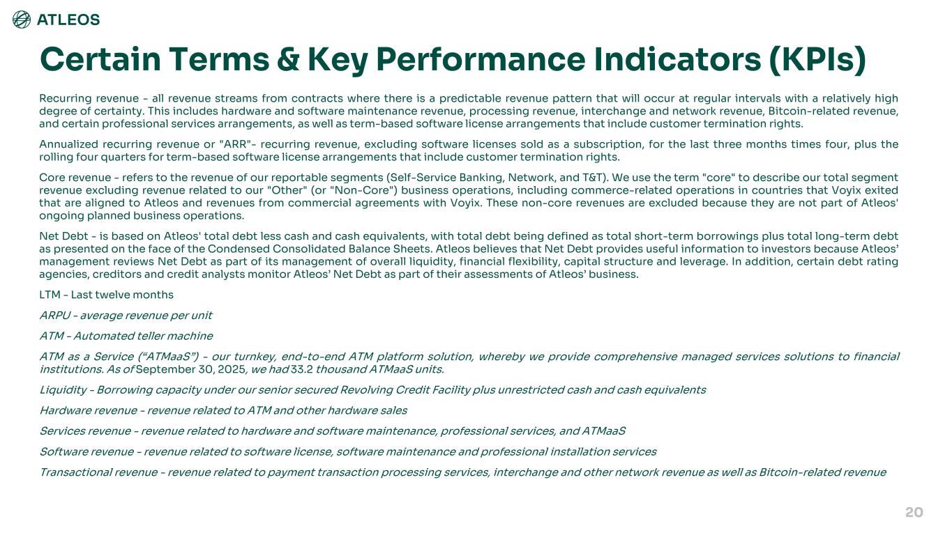 Recurring revenue - all revenue streams from contracts where there is a predictable revenue pattern that will occur at regular intervals with a relatively high degree of certainty. This includes hardware and software maintenance revenue, processing revenue, interchange and network revenue, Bitcoin-related revenue, and certain professional services arrangements, as well as term-based software license arrangements that include customer termination rights. Annualized recurring revenue or "ARR"- recurring revenue, excluding software licenses sold as a subscription, for the last three months times four, plus the rolling four quarters for term-based software license arrangements that include customer termination rights. Core revenue - refers to the revenue of our reportable segments (Self-Service Banking, Network, and T&T). We use the term "core" to describe our total segment revenue excluding revenue related to our "Other" (or "Non-Core") business operations, including commerce-related operations in countries that Voyix exited that are aligned to Atleos and revenues from commercial agreements with Voyix. These non-core revenues are excluded because they are not part of Atleos' ongoing planned business operations. Net Debt - is based on Atleos' total debt less cash and cash equivalents, with total debt being defined as total short-term borrowings plus total long-term debt as presented on the face of the Condensed Consolidated Balance Sheets. Atleos believes that Net Debt provides useful information to investors because Atleos’ management reviews Net Debt as part of its management of overall liquidity, financial flexibility, capital structure and leverage. In addition, certain debt rating agencies, creditors and credit analysts monitor Atleos’ Net Debt as part of their assessments of Atleos’ business. LTM - Last twelve months ARPU - average revenue per unit ATM - Automated teller machine ATM as a Service (“ATMaaS”) - our turnkey, end-to-end ATM platform solution, whereby we provide comprehensive managed services solutions to financial institutions. As of September 30, 2025, we had 33.2 thousand ATMaaS units. Liquidity - Borrowing capacity under our senior secured Revolving Credit Facility plus unrestricted cash and cash equivalents Hardware revenue - revenue related to ATM and other hardware sales Services revenue - revenue related to hardware and software maintenance, professional services, and ATMaaS Software revenue - revenue related to software license, software maintenance and professional installation services Transactional revenue - revenue related to payment transaction processing services, interchange and other network revenue as well as Bitcoin-related revenue Certain Terms & Key Performance Indicators (KPIs) 20