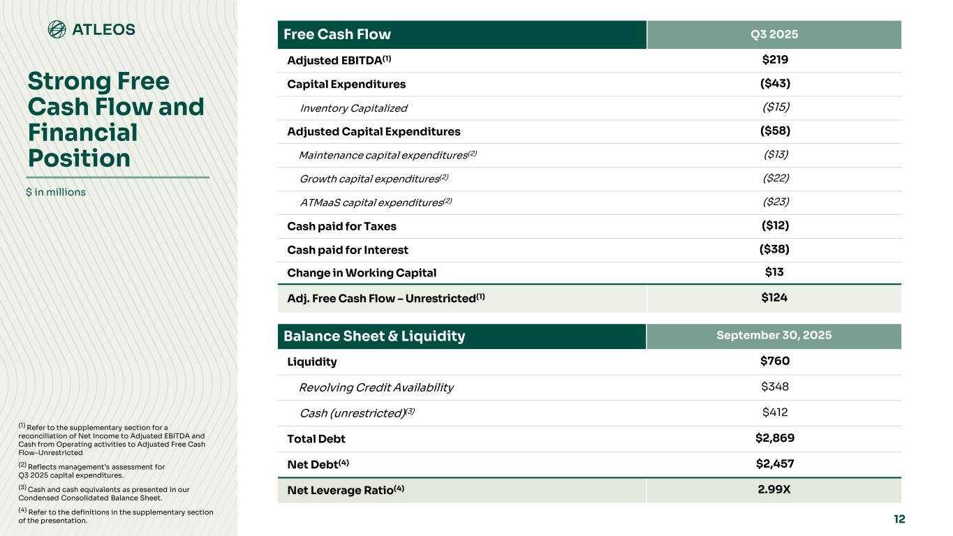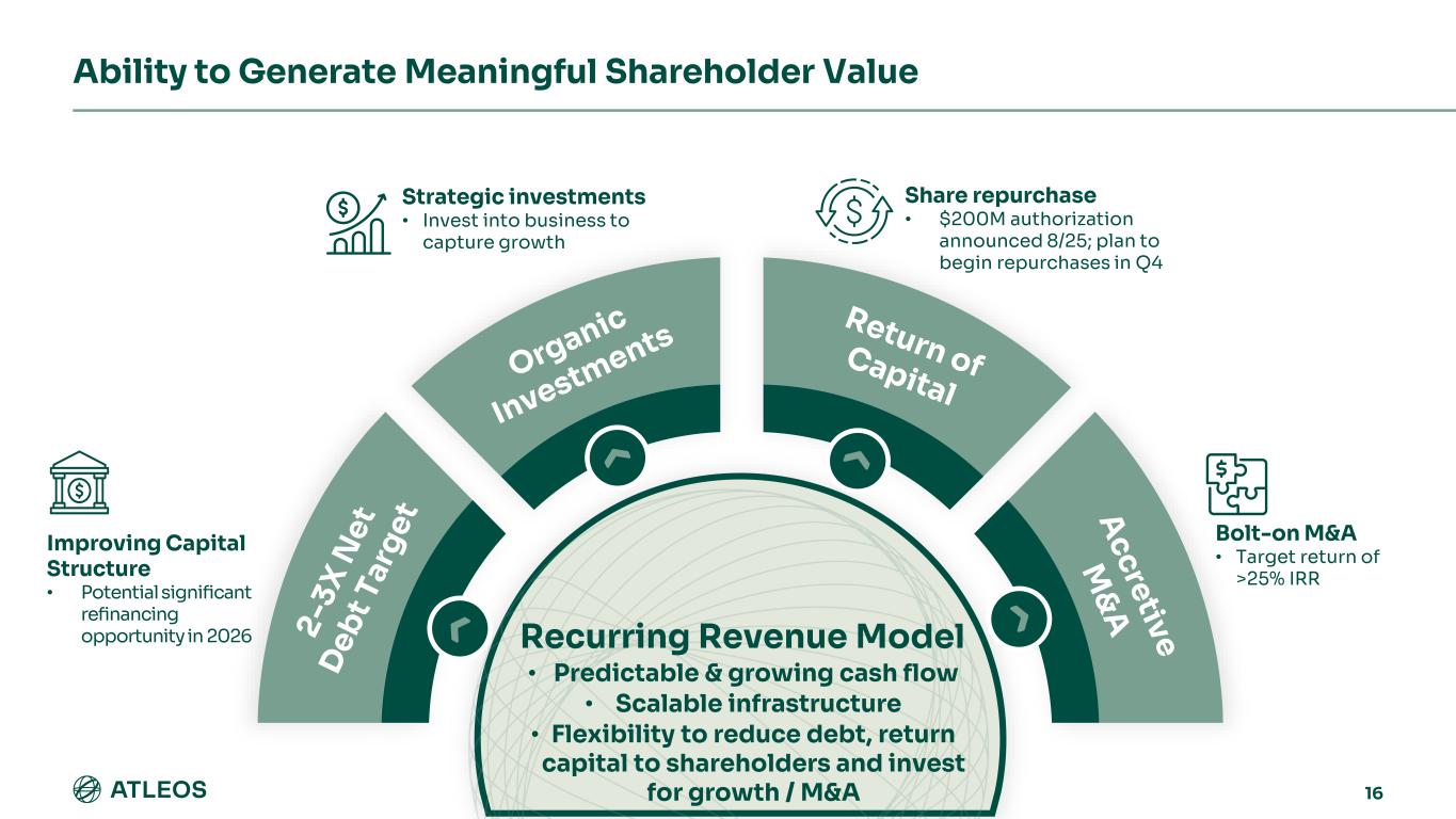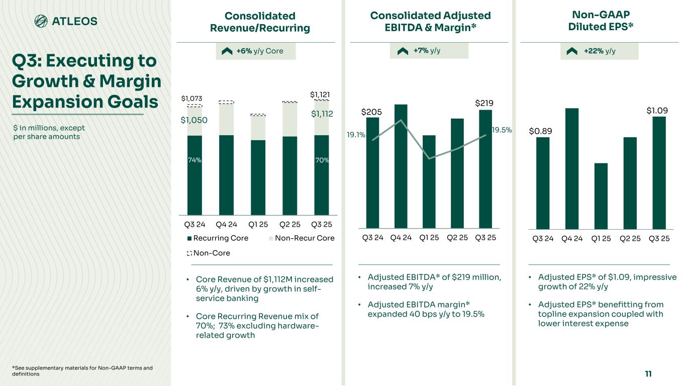 Recurring revenue - all revenue streams from contracts where there is a predictable revenue pattern that will occur at regular intervals with a relatively high degree of certainty. This includes hardware and software maintenance revenue, processing revenue, interchange and network revenue, Bitcoin-related revenue, and certain professional services arrangements, as well as term-based software license arrangements that include customer termination rights. Annualized recurring revenue or "ARR"- recurring revenue, excluding software licenses sold as a subscription, for the last three months times four, plus the rolling four quarters for term-based software license arrangements that include customer termination rights. Core revenue - refers to the revenue of our reportable segments (Self-Service Banking, Network, and T&T). We use the term "core" to describe our total segment revenue excluding revenue related to our "Other" (or "Non-Core") business operations, including commerce-related operations in countries that Voyix exited that are aligned to Atleos and revenues from commercial agreements with Voyix. These non-core revenues are excluded because they are not part of Atleos' ongoing planned business operations. Net Debt - is based on Atleos' total debt less cash and cash equivalents, with total debt being defined as total short-term borrowings plus total long-term debt as presented on the face of the Condensed Consolidated Balance Sheets. Atleos believes that Net Debt provides useful information to investors because Atleos’ management reviews Net Debt as part of its management of overall liquidity, financial flexibility, capital structure and leverage. In addition, certain debt rating agencies, creditors and credit analysts monitor Atleos’ Net Debt as part of their assessments of Atleos’ business. LTM - Last twelve months ARPU - average revenue per unit ATM - Automated teller machine ATM as a Service (“ATMaaS”) - our turnkey, end-to-end ATM platform solution, whereby we provide comprehensive managed services solutions to financial institutions. As of September 30, 2025, we had 33.2 thousand ATMaaS units. Liquidity - Borrowing capacity under our senior secured Revolving Credit Facility plus unrestricted cash and cash equivalents Hardware revenue - revenue related to ATM and other hardware sales Services revenue - revenue related to hardware and software maintenance, professional services, and ATMaaS Software revenue - revenue related to software license, software maintenance and professional installation services Transactional revenue - revenue related to payment transaction processing services, interchange and other network revenue as well as Bitcoin-related revenue Certain Terms & Key Performance Indicators (KPIs) 20