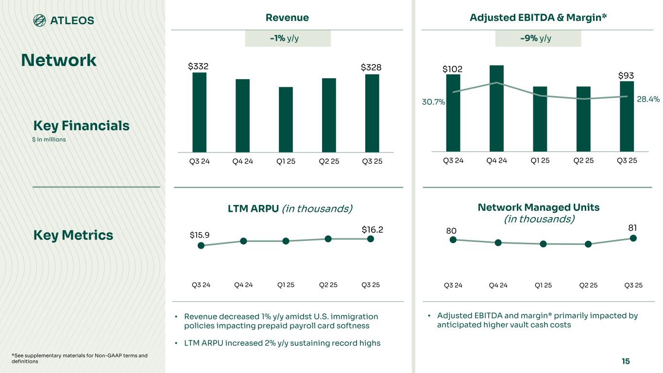 15 Key Financials Key Metrics $ in millions Revenue Adjusted EBITDA & Margin* LTM ARPU (in thousands) Network Managed Units (in thousands) Network -1% y/y -9% y/y Q3 24 Q4 24 Q1 25 Q2 25 Q3 25 $328$332 Q3 24 Q4 24 Q1 25 Q2 25 Q3 25 $102 $93 Q3 24 Q4 24 Q1 25 Q2 25 Q3 25 Q3 24 Q4 24 Q1 25 Q2 25 Q3 25 $15.9 $16.2 80 81 • Revenue decreased 1% y/y amidst U.S. immigration policies impacting prepaid payroll card softness • LTM ARPU increased 2% y/y sustaining record highs • Adjusted EBITDA and margin* primarily impacted by anticipated higher vault cash costs 30.7% 28.4% *See supplementary materials for Non-GAAP terms and definitions