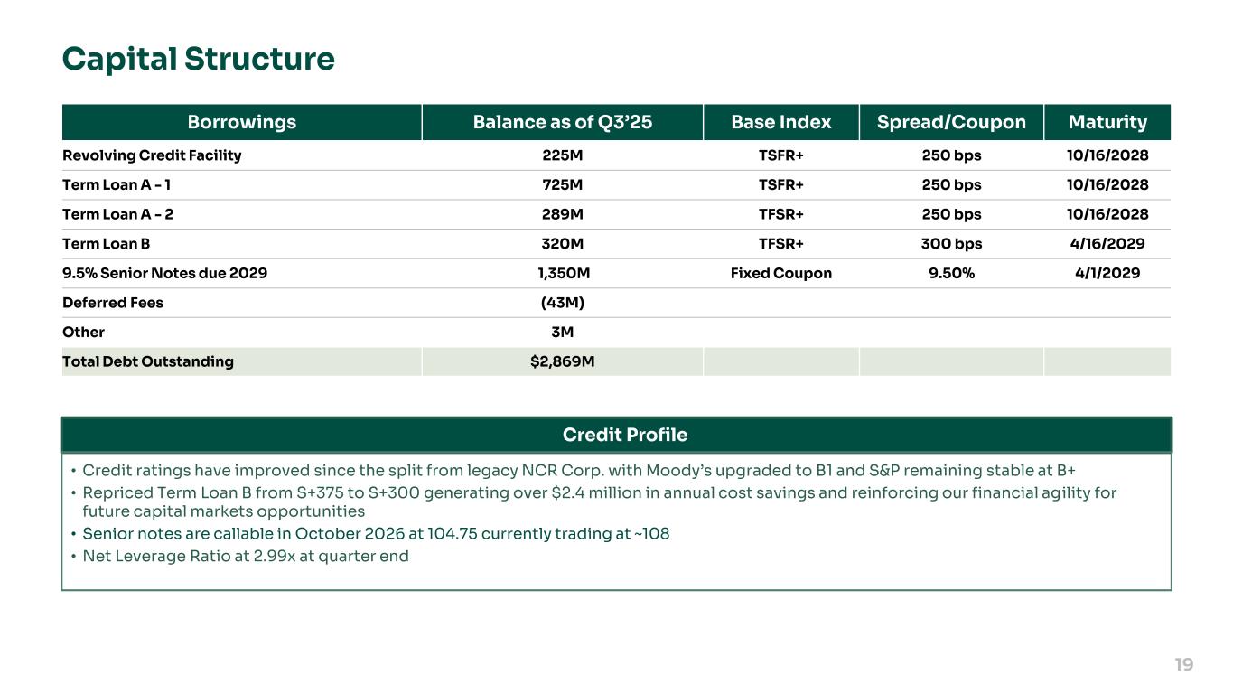 Capital Structure Borrowings Balance as of Q3’25 Base Index Spread/Coupon Maturity Revolving Credit Facility 225M TSFR+ 250 bps 10/16/2028 Term Loan A - 1 725M TSFR+ 250 bps 10/16/2028 Term Loan A - 2 289M TFSR+ 250 bps 10/16/2028 Term Loan B 320M TFSR+ 300 bps 4/16/2029 9.5% Senior Notes due 2029 1,350M Fixed Coupon 9.50% 4/1/2029 Deferred Fees (43M) Other 3M Total Debt Outstanding $2,869M • Credit Profile • Credit ratings have improved since the split from legacy NCR Corp. with Moody’s upgraded to B1 and S&P remaining stable at B+ • Repriced Term Loan B from S+375 to S+300 generating over $2.4 million in annual cost savings and reinforcing our financial agility for future capital markets opportunities • Senior notes are callable in October 2026 at 104.75 currently trading at ~108 • Net Leverage Ratio at 2.99x at quarter end 19