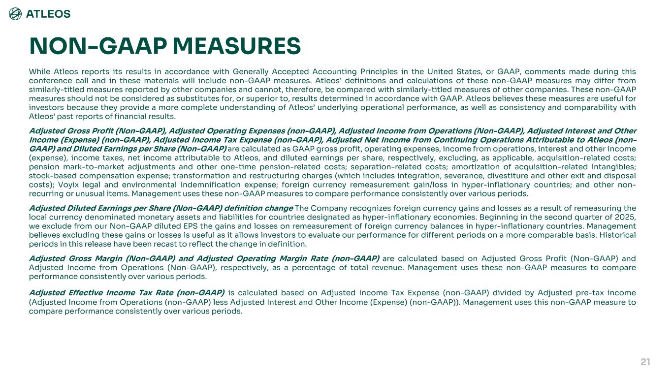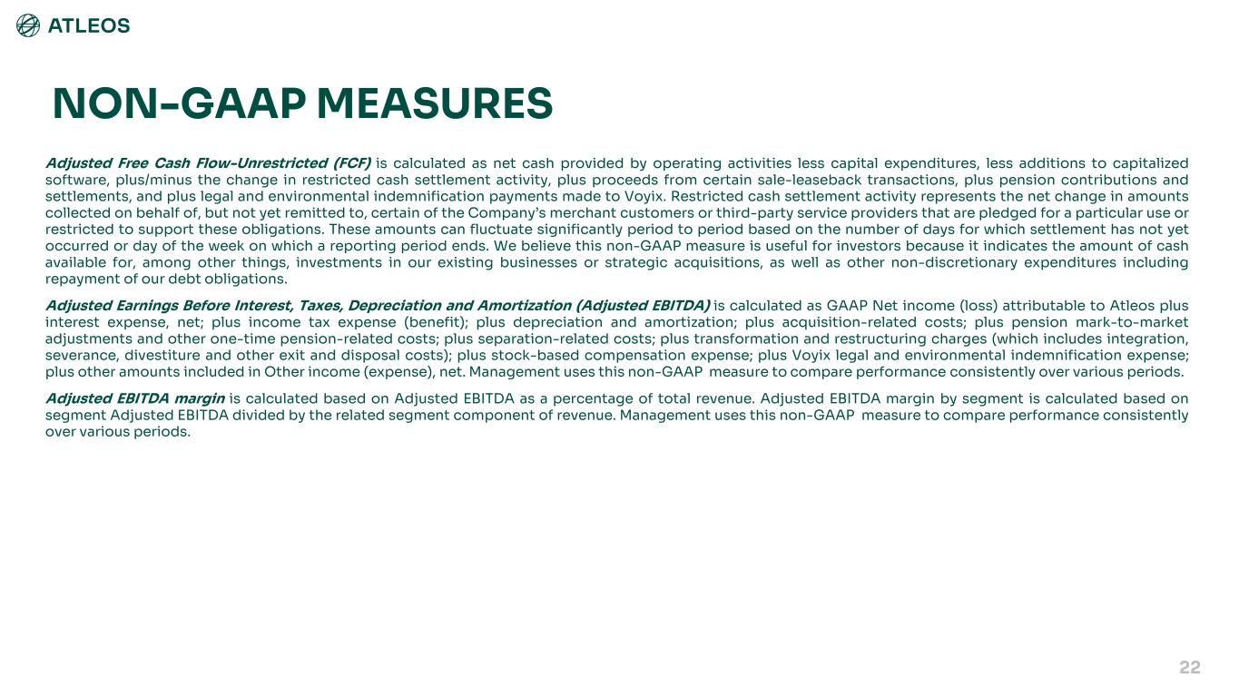 While Atleos reports its results in accordance with Generally Accepted Accounting Principles in the United States, or GAAP, comments made during this conference call and in these materials will include non-GAAP measures. Atleos’ definitions and calculations of these non-GAAP measures may differ from similarly-titled measures reported by other companies and cannot, therefore, be compared with similarly-titled measures of other companies. These non-GAAP measures should not be considered as substitutes for, or superior to, results determined in accordance with GAAP. Atleos believes these measures are useful for investors because they provide a more complete understanding of Atleos’ underlying operational performance, as well as consistency and comparability with Atleos’ past reports of financial results. Adjusted Gross Profit (Non-GAAP), Adjusted Operating Expenses (non-GAAP), Adjusted Income from Operations (Non-GAAP), Adjusted Interest and Other Income (Expense) (non-GAAP), Adjusted Income Tax Expense (non-GAAP), Adjusted Net Income from Continuing Operations Attributable to Atleos (non- GAAP) and Diluted Earnings per Share (Non-GAAP) are calculated as GAAP gross profit, operating expenses, income from operations, interest and other income (expense), income taxes, net income attributable to Atleos, and diluted earnings per share, respectively, excluding, as applicable, acquisition-related costs; pension mark-to-market adjustments and other one-time pension-related costs; separation-related costs; amortization of acquisition-related intangibles; stock-based compensation expense; transformation and restructuring charges (which includes integration, severance, divestiture and other exit and disposal costs); Voyix legal and environmental indemnification expense; foreign currency remeasurement gain/loss in hyper-inflationary countries; and other non- recurring or unusual items. Management uses these non-GAAP measures to compare performance consistently over various periods. Adjusted Diluted Earnings per Share (Non-GAAP) definition change The Company recognizes foreign currency gains and losses as a result of remeasuring the local currency denominated monetary assets and liabilities for countries designated as hyper-inflationary economies. Beginning in the second quarter of 2025, we exclude from our Non-GAAP diluted EPS the gains and losses on remeasurement of foreign currency balances in hyper-inflationary countries. Management believes excluding these gains or losses is useful as it allows investors to evaluate our performance for different periods on a more comparable basis. Historical periods in this release have been recast to reflect the change in definition. Adjusted Gross Margin (Non-GAAP) and Adjusted Operating Margin Rate (non-GAAP) are calculated based on Adjusted Gross Profit (Non-GAAP) and Adjusted Income from Operations (Non-GAAP), respectively, as a percentage of total revenue. Management uses these non-GAAP measures to compare performance consistently over various periods. Adjusted Effective Income Tax Rate (non-GAAP) is calculated based on Adjusted Income Tax Expense (non-GAAP) divided by Adjusted pre-tax income (Adjusted Income from Operations (non-GAAP) less Adjusted Interest and Other Income (Expense) (non-GAAP)). Management uses this non-GAAP measure to compare performance consistently over various periods. NON-GAAP MEASURES 21