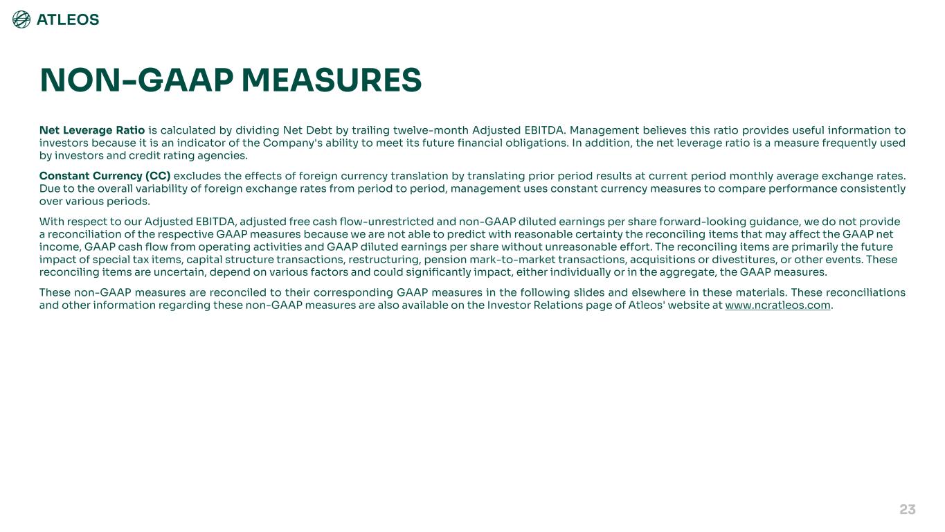 Adjusted Free Cash Flow-Unrestricted (FCF) is calculated as net cash provided by operating activities less capital expenditures, less additions to capitalized software, plus/minus the change in restricted cash settlement activity, plus proceeds from certain sale-leaseback transactions, plus pension contributions and settlements, and plus legal and environmental indemnification payments made to Voyix. Restricted cash settlement activity represents the net change in amounts collected on behalf of, but not yet remitted to, certain of the Company’s merchant customers or third-party service providers that are pledged for a particular use or restricted to support these obligations. These amounts can fluctuate significantly period to period based on the number of days for which settlement has not yet occurred or day of the week on which a reporting period ends. We believe this non-GAAP measure is useful for investors because it indicates the amount of cash available for, among other things, investments in our existing businesses or strategic acquisitions, as well as other non-discretionary expenditures including repayment of our debt obligations. Adjusted Earnings Before Interest, Taxes, Depreciation and Amortization (Adjusted EBITDA) is calculated as GAAP Net income (loss) attributable to Atleos plus interest expense, net; plus income tax expense (benefit); plus depreciation and amortization; plus acquisition-related costs; plus pension mark-to-market adjustments and other one-time pension-related costs; plus separation-related costs; plus transformation and restructuring charges (which includes integration, severance, divestiture and other exit and disposal costs); plus stock-based compensation expense; plus Voyix legal and environmental indemnification expense; plus other amounts included in Other income (expense), net. Management uses this non-GAAP measure to compare performance consistently over various periods. Adjusted EBITDA margin is calculated based on Adjusted EBITDA as a percentage of total revenue. Adjusted EBITDA margin by segment is calculated based on segment Adjusted EBITDA divided by the related segment component of revenue. Management uses this non-GAAP measure to compare performance consistently over various periods. NON-GAAP MEASURES 22
