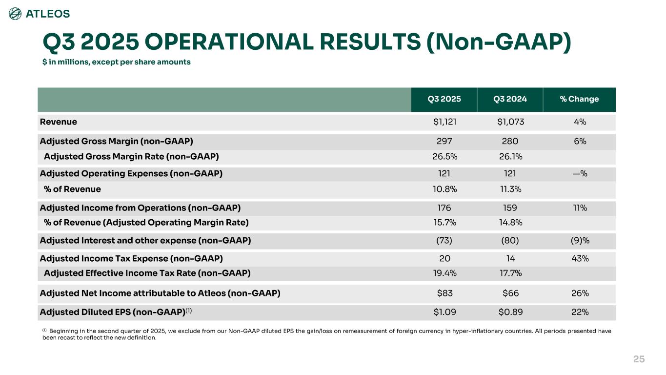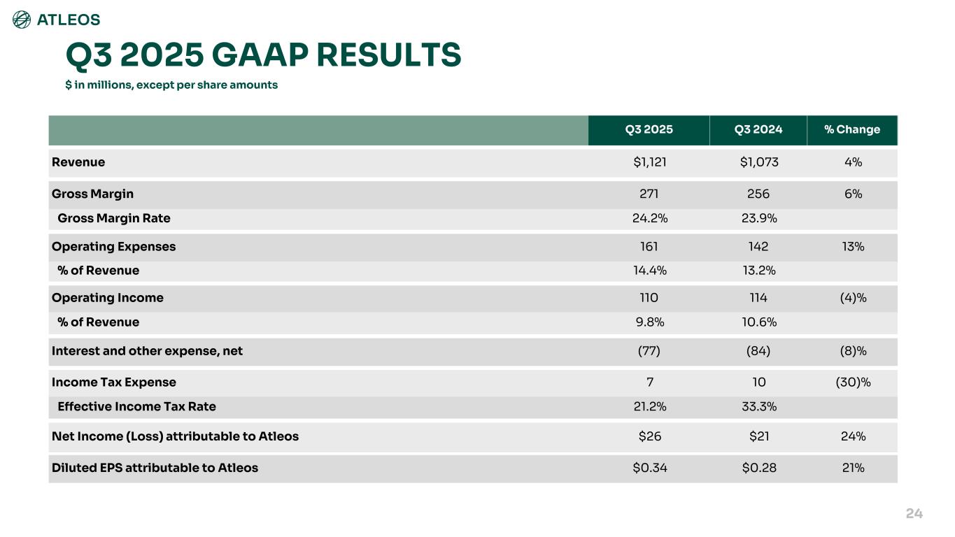 Q3 2025 Q3 2024 % Change Revenue $1,121 $1,073 4% Gross Margin 271 256 6% Gross Margin Rate 24.2% 23.9% Operating Expenses 161 142 13% % of Revenue 14.4% 13.2% Operating Income 110 114 (4)% % of Revenue 9.8% 10.6% Interest and other expense, net (77) (84) (8)% Income Tax Expense 7 10 (30)% Effective Income Tax Rate 21.2% 33.3% Net Income (Loss) attributable to Atleos $26 $21 24% Diluted EPS attributable to Atleos $0.34 $0.28 21% $ in millions, except per share amounts Q3 2025 GAAP RESULTS 24