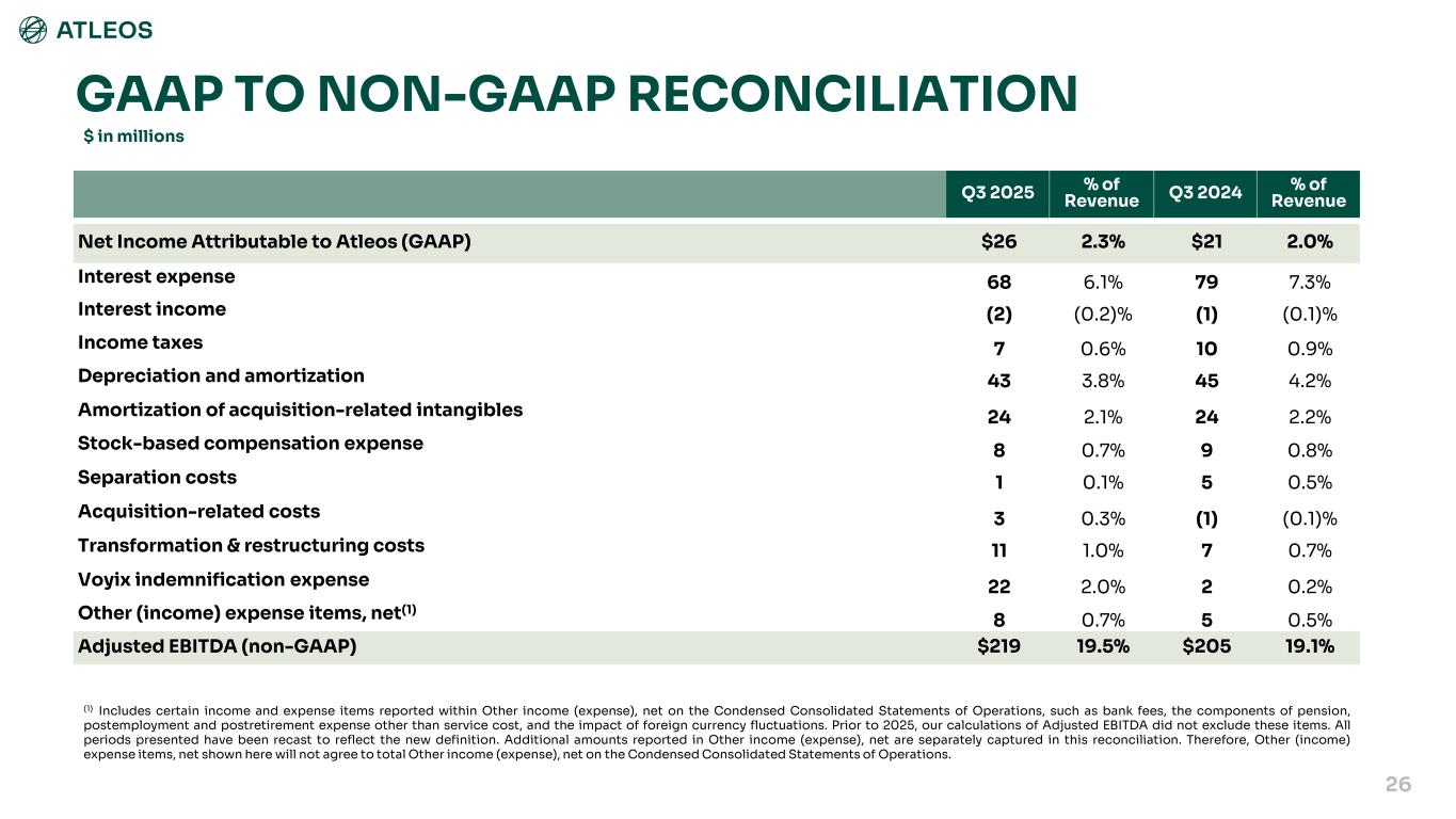 Q3 2025 Q3 2024 % Change Revenue $1,121 $1,073 4% Adjusted Gross Margin (non-GAAP) 297 280 6% Adjusted Gross Margin Rate (non-GAAP) 26.5% 26.1% Adjusted Operating Expenses (non-GAAP) 121 121 —% % of Revenue 10.8% 11.3% Adjusted Income from Operations (non-GAAP) 176 159 11% % of Revenue (Adjusted Operating Margin Rate) 15.7% 14.8% Adjusted Interest and other expense (non-GAAP) (73) (80) (9)% Adjusted Income Tax Expense (non-GAAP) 20 14 43% Adjusted Effective Income Tax Rate (non-GAAP) 19.4% 17.7% Adjusted Net Income attributable to Atleos (non-GAAP) $83 $66 26% Adjusted Diluted EPS (non-GAAP)(1) $1.09 $0.89 22% $ in millions, except per share amounts Q3 2025 OPERATIONAL RESULTS (Non-GAAP) 25 (1) Beginning in the second quarter of 2025, we exclude from our Non-GAAP diluted EPS the gain/loss on remeasurement of foreign currency in hyper-inflationary countries. All periods presented have been recast to reflect the new definition.