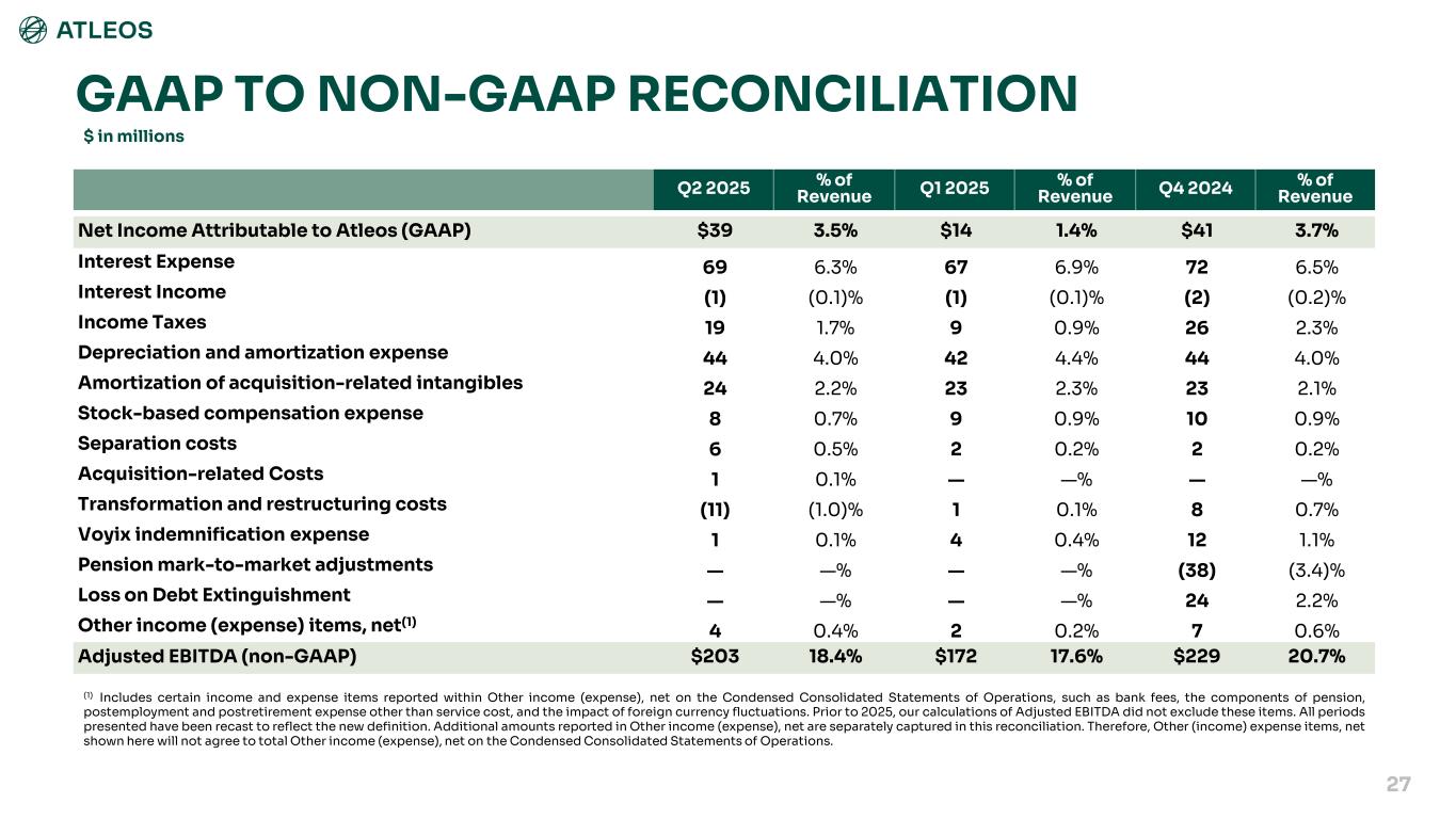 Q3 2025 % of Revenue Q3 2024 % of Revenue Net Income Attributable to Atleos (GAAP) $26 2.3% $21 2.0% Interest expense 68 6.1% 79 7.3% Interest income (2) (0.2)% (1) (0.1)% Income taxes 7 0.6% 10 0.9% Depreciation and amortization 43 3.8% 45 4.2% Amortization of acquisition-related intangibles 24 2.1% 24 2.2% Stock-based compensation expense 8 0.7% 9 0.8% Separation costs 1 0.1% 5 0.5% Acquisition-related costs 3 0.3% (1) (0.1)% Transformation & restructuring costs 11 1.0% 7 0.7% Voyix indemnification expense 22 2.0% 2 0.2% Other (income) expense items, net(1) 8 0.7% 5 0.5% Adjusted EBITDA (non-GAAP) $219 19.5% $205 19.1% GAAP TO NON-GAAP RECONCILIATION $ in millions 26 (1) Includes certain income and expense items reported within Other income (expense), net on the Condensed Consolidated Statements of Operations, such as bank fees, the components of pension, postemployment and postretirement expense other than service cost, and the impact of foreign currency fluctuations. Prior to 2025, our calculations of Adjusted EBITDA did not exclude these items. All periods presented have been recast to reflect the new definition. Additional amounts reported in Other income (expense), net are separately captured in this reconciliation. Therefore, Other (income) expense items, net shown here will not agree to total Other income (expense), net on the Condensed Consolidated Statements of Operations.