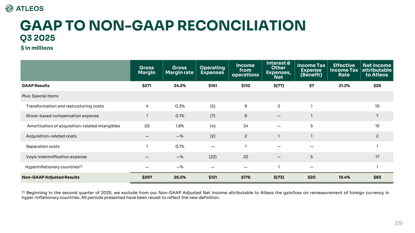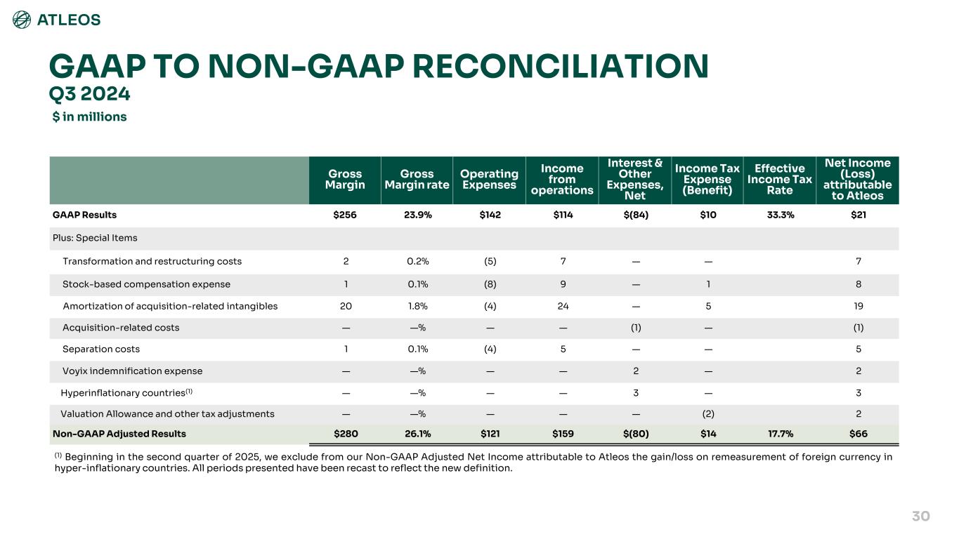 GAAP TO NON-GAAP RECONCILIATION $ in millions Gross Margin Gross Margin rate Operating Expenses Income from operations Interest & Other Expenses, Net Income Tax Expense (Benefit) Effective Income Tax Rate Net Income attributable to Atleos GAAP Results $271 24.2% $161 $110 $(77) $7 21.2% $26 Plus: Special Items Transformation and restructuring costs 4 0.3% (5) 9 2 1 10 Stock-based compensation expense 1 0.1% (7) 8 — 1 7 Amortization of acquisition-related intangibles 20 1.8% (4) 24 — 5 19 Acquisition-related costs — —% (2) 2 1 1 2 Separation costs 1 0.1% — 1 — — 1 Voyix indemnification expense — —% (22) 22 — 5 17 Hyperinflationary countries(1) — —% — — 1 — 1 Non-GAAP Adjusted Results $297 26.5% $121 $176 $(73) $20 19.4% $83 Q3 2025 29 (1) Beginning in the second quarter of 2025, we exclude from our Non-GAAP Adjusted Net Income attributable to Atleos the gain/loss on remeasurement of foreign currency in hyper-inflationary countries. All periods presented have been recast to reflect the new definition.