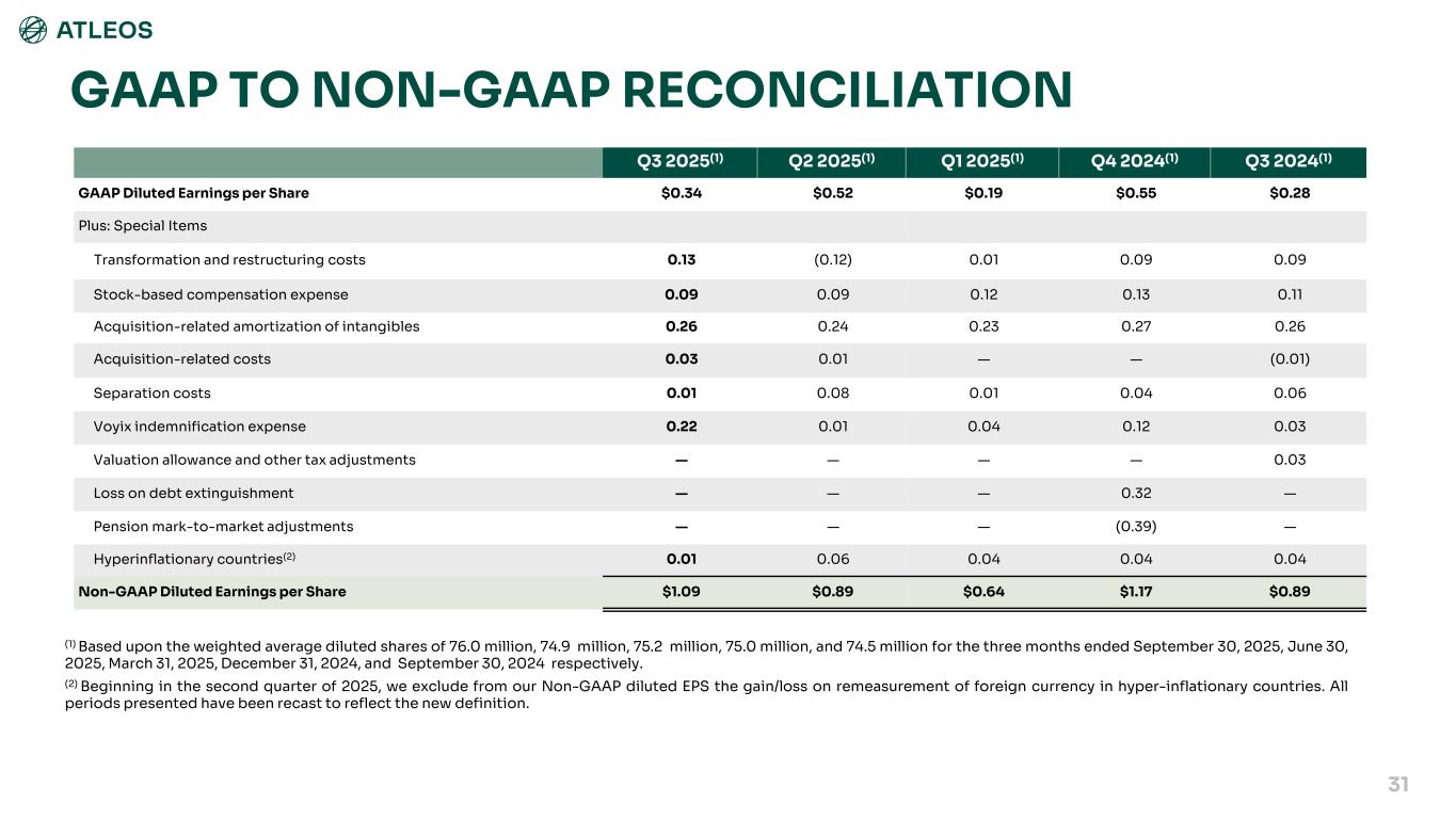 GAAP TO NON-GAAP RECONCILIATION $ in millions Gross Margin Gross Margin rate Operating Expenses Income from operations Interest & Other Expenses, Net Income Tax Expense (Benefit) Effective Income Tax Rate Net Income (Loss) attributable to Atleos GAAP Results $256 23.9% $142 $114 $(84) $10 33.3% $21 Plus: Special Items Transformation and restructuring costs 2 0.2% (5) 7 — — 7 Stock-based compensation expense 1 0.1% (8) 9 — 1 8 Amortization of acquisition-related intangibles 20 1.8% (4) 24 — 5 19 Acquisition-related costs — —% — — (1) — (1) Separation costs 1 0.1% (4) 5 — — 5 Voyix indemnification expense — —% — — 2 — 2 Hyperinflationary countries(1) — —% — — 3 — 3 Valuation Allowance and other tax adjustments — —% — — — (2) 2 Non-GAAP Adjusted Results $280 26.1% $121 $159 $(80) $14 17.7% $66 Q3 2024 30 (1) Beginning in the second quarter of 2025, we exclude from our Non-GAAP Adjusted Net Income attributable to Atleos the gain/loss on remeasurement of foreign currency in hyper-inflationary countries. All periods presented have been recast to reflect the new definition.