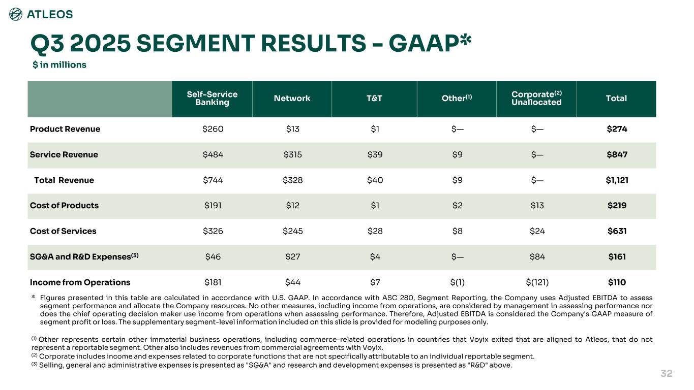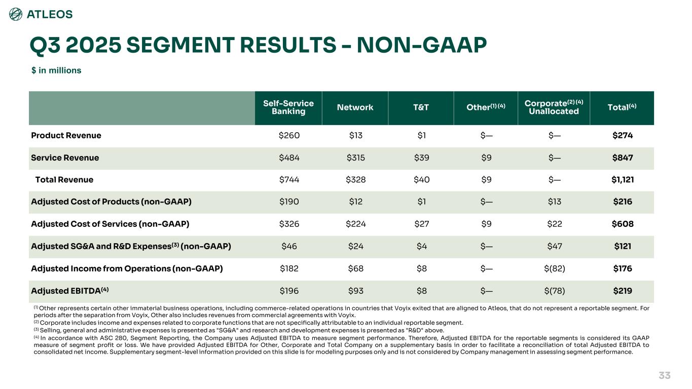 * Figures presented in this table are calculated in accordance with U.S. GAAP. In accordance with ASC 280, Segment Reporting, the Company uses Adjusted EBITDA to assess segment performance and allocate the Company resources. No other measures, including income from operations, are considered by management in assessing performance nor does the chief operating decision maker use income from operations when assessing performance. Therefore, Adjusted EBITDA is considered the Company's GAAP measure of segment profit or loss. The supplementary segment-level information included on this slide is provided for modeling purposes only. (1) Other represents certain other immaterial business operations, including commerce-related operations in countries that Voyix exited that are aligned to Atleos, that do not represent a reportable segment. Other also includes revenues from commercial agreements with Voyix. (2) Corporate includes income and expenses related to corporate functions that are not specifically attributable to an individual reportable segment. (3) Selling, general and administrative expenses is presented as "SG&A" and research and development expenses is presented as "R&D" above. Self-Service Banking Network T&T Other(1) Corporate(2) Unallocated Total Product Revenue $260 $13 $1 $— $— $274 Service Revenue $484 $315 $39 $9 $— $847 Total Revenue $744 $328 $40 $9 $— $1,121 Cost of Products $191 $12 $1 $2 $13 $219 Cost of Services $326 $245 $28 $8 $24 $631 SG&A and R&D Expenses(3) $46 $27 $4 $— $84 $161 Income from Operations $181 $44 $7 $(1) $(121) $110 Q3 2025 SEGMENT RESULTS - GAAP* $ in millions 32