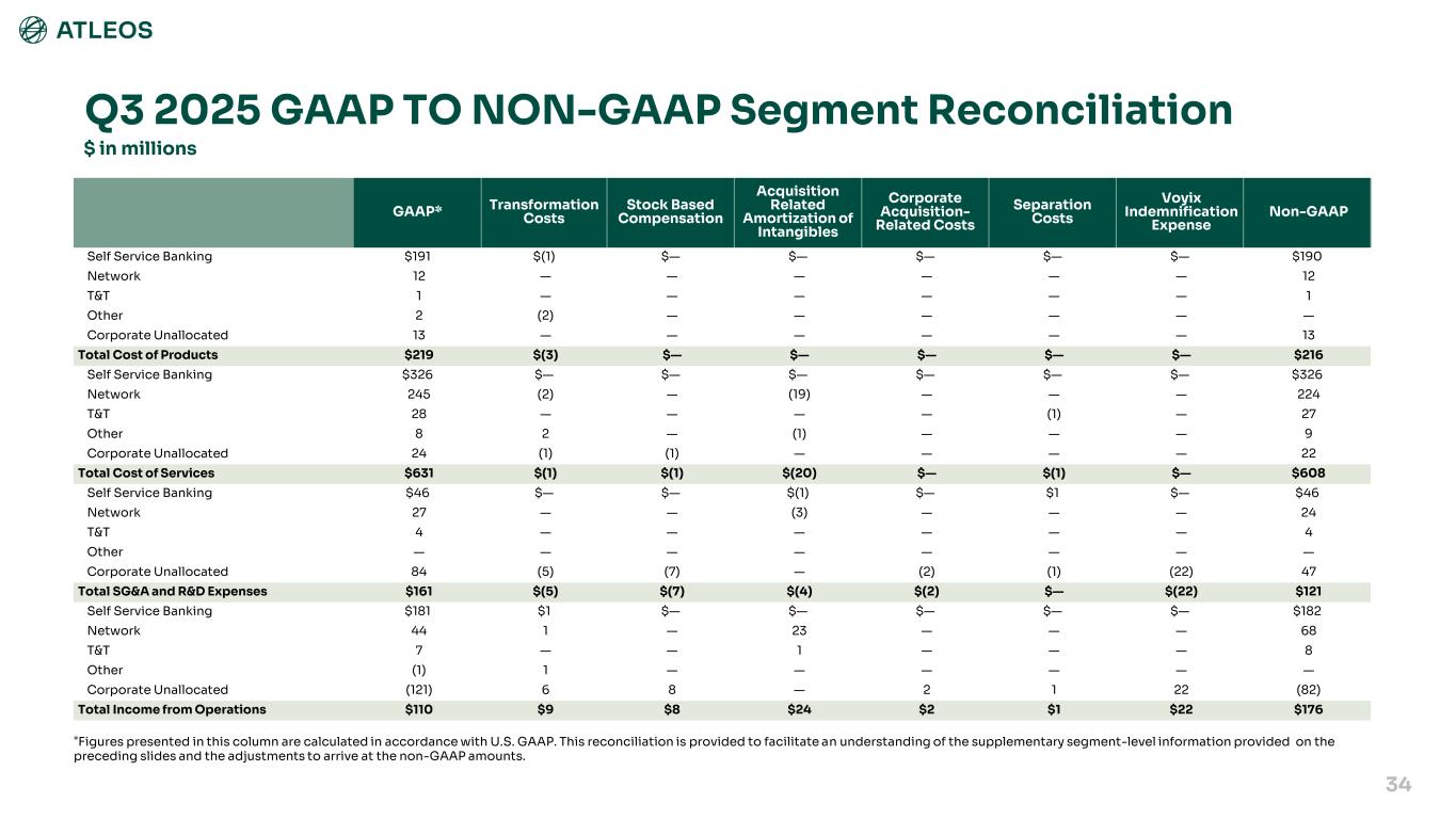 Self-Service Banking Network T&T Other(1) (4) Corporate(2) (4) Unallocated Total(4) Product Revenue $260 $13 $1 $— $— $274 Service Revenue $484 $315 $39 $9 $— $847 Total Revenue $744 $328 $40 $9 $— $1,121 Adjusted Cost of Products (non-GAAP) $190 $12 $1 $— $13 $216 Adjusted Cost of Services (non-GAAP) $326 $224 $27 $9 $22 $608 Adjusted SG&A and R&D Expenses(3) (non-GAAP) $46 $24 $4 $— $47 $121 Adjusted Income from Operations (non-GAAP) $182 $68 $8 $— $(82) $176 Adjusted EBITDA(4) $196 $93 $8 $— $(78) $219 Q3 2025 SEGMENT RESULTS - NON-GAAP $ in millions 33 (1) Other represents certain other immaterial business operations, including commerce-related operations in countries that Voyix exited that are aligned to Atleos, that do not represent a reportable segment. For periods after the separation from Voyix, Other also includes revenues from commercial agreements with Voyix. (2) Corporate includes income and expenses related to corporate functions that are not specifically attributable to an individual reportable segment. (3) Selling, general and administrative expenses is presented as "SG&A" and research and development expenses is presented as "R&D" above. (4) In accordance with ASC 280, Segment Reporting, the Company uses Adjusted EBITDA to measure segment performance. Therefore, Adjusted EBITDA for the reportable segments is considered its GAAP measure of segment profit or loss. We have provided Adjusted EBITDA for Other, Corporate and Total Company on a supplementary basis in order to facilitate a reconciliation of total Adjusted EBITDA to consolidated net income. Supplementary segment-level information provided on this slide is for modeling purposes only and is not considered by Company management in assessing segment performance.