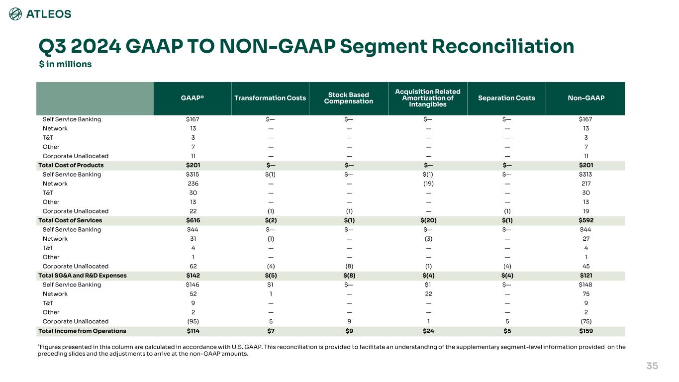 GAAP* Transformation Costs Stock Based Compensation Acquisition Related Amortization of Intangibles Corporate Acquisition- Related Costs Separation Costs Voyix Indemnification Expense Non-GAAP Self Service Banking $191 $(1) $— $— $— $— $— $190 Network 12 — — — — — — 12 T&T 1 — — — — — — 1 Other 2 (2) — — — — — — Corporate Unallocated 13 — — — — — — 13 Total Cost of Products $219 $(3) $— $— $— $— $— $216 Self Service Banking $326 $— $— $— $— $— $— $326 Network 245 (2) — (19) — — — 224 T&T 28 — — — — (1) — 27 Other 8 2 — (1) — — — 9 Corporate Unallocated 24 (1) (1) — — — — 22 Total Cost of Services $631 $(1) $(1) $(20) $— $(1) $— $608 Self Service Banking $46 $— $— $(1) $— $1 $— $46 Network 27 — — (3) — — — 24 T&T 4 — — — — — — 4 Other — — — — — — — — Corporate Unallocated 84 (5) (7) — (2) (1) (22) 47 Total SG&A and R&D Expenses $161 $(5) $(7) $(4) $(2) $— $(22) $121 Self Service Banking $181 $1 $— $— $— $— $— $182 Network 44 1 — 23 — — — 68 T&T 7 — — 1 — — — 8 Other (1) 1 — — — — — — Corporate Unallocated (121) 6 8 — 2 1 22 (82) Total Income from Operations $110 $9 $8 $24 $2 $1 $22 $176 Q3 2025 GAAP TO NON-GAAP Segment Reconciliation $ in millions 34 *Figures presented in this column are calculated in accordance with U.S. GAAP. This reconciliation is provided to facilitate an understanding of the supplementary segment-level information provided on the preceding slides and the adjustments to arrive at the non-GAAP amounts.