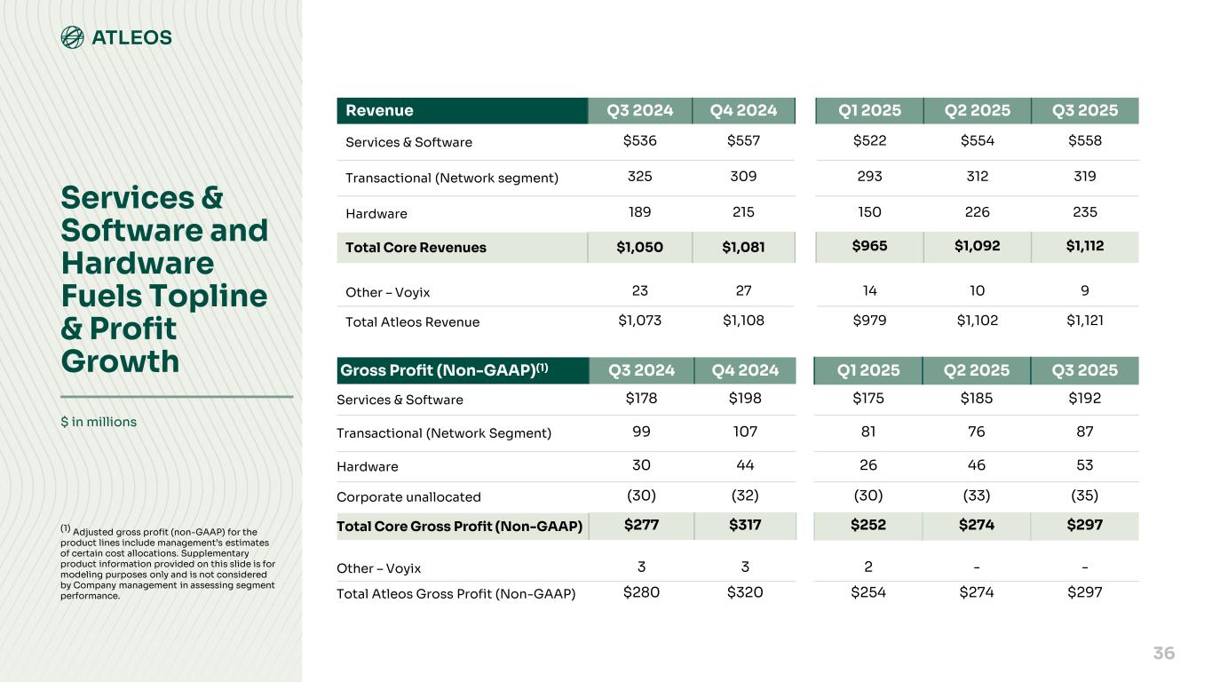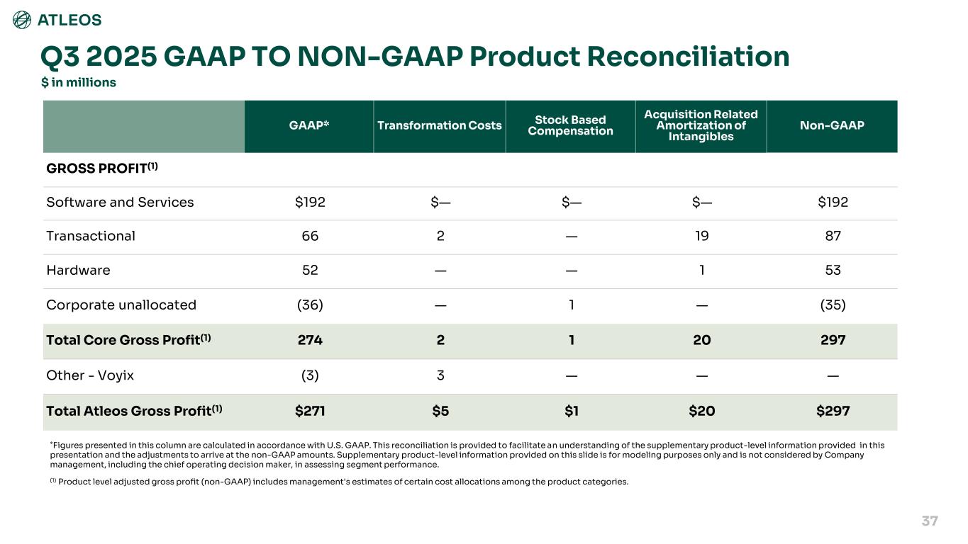Services & Software and Hardware Fuels Topline & Profit Growth $ in millions (1) Adjusted gross profit (non-GAAP) for the product lines include management’s estimates of certain cost allocations. Supplementary product information provided on this slide is for modeling purposes only and is not considered by Company management in assessing segment performance. Revenue Q3 2024 Q4 2024 Q1 2025 Q2 2025 Q3 2025 Services & Software $536 $557 $522 $554 $558 Transactional (Network segment) 325 309 293 312 319 Hardware 189 215 150 226 235 Total Core Revenues $1,050 $1,081 $965 $1,092 $1,112 Other – Voyix 23 27 14 10 9 Total Atleos Revenue $1,073 $1,108 $979 $1,102 $1,121 Gross Profit (Non-GAAP)(1) Q3 2024 Q4 2024 Q1 2025 Q2 2025 Q3 2025 Services & Software $178 $198 $175 $185 $192 Transactional (Network Segment) 99 107 81 76 87 Hardware 30 44 26 46 53 Corporate unallocated (30) (32) (30) (33) (35) Total Core Gross Profit (Non-GAAP) $277 $317 $252 $274 $297 Other – Voyix 3 3 2 - - Total Atleos Gross Profit (Non-GAAP) $280 $320 $254 $274 $297 36
