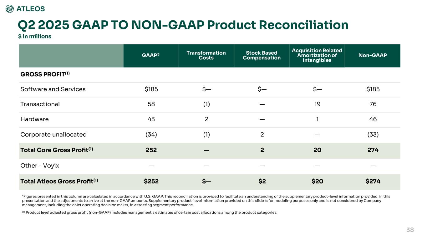 GAAP* Transformation Costs Stock Based Compensation Acquisition Related Amortization of Intangibles Non-GAAP GROSS PROFIT(1) Software and Services $192 $— $— $— $192 Transactional 66 2 — 19 87 Hardware 52 — — 1 53 Corporate unallocated (36) — 1 — (35) Total Core Gross Profit(1) 274 2 1 20 297 Other - Voyix (3) 3 — — — Total Atleos Gross Profit(1) $271 $5 $1 $20 $297 Q3 2025 GAAP TO NON-GAAP Product Reconciliation $ in millions 37 *Figures presented in this column are calculated in accordance with U.S. GAAP. This reconciliation is provided to facilitate an understanding of the supplementary product-level information provided in this presentation and the adjustments to arrive at the non-GAAP amounts. Supplementary product-level information provided on this slide is for modeling purposes only and is not considered by Company management, including the chief operating decision maker, in assessing segment performance. (1) Product level adjusted gross profit (non-GAAP) includes management's estimates of certain cost allocations among the product categories.