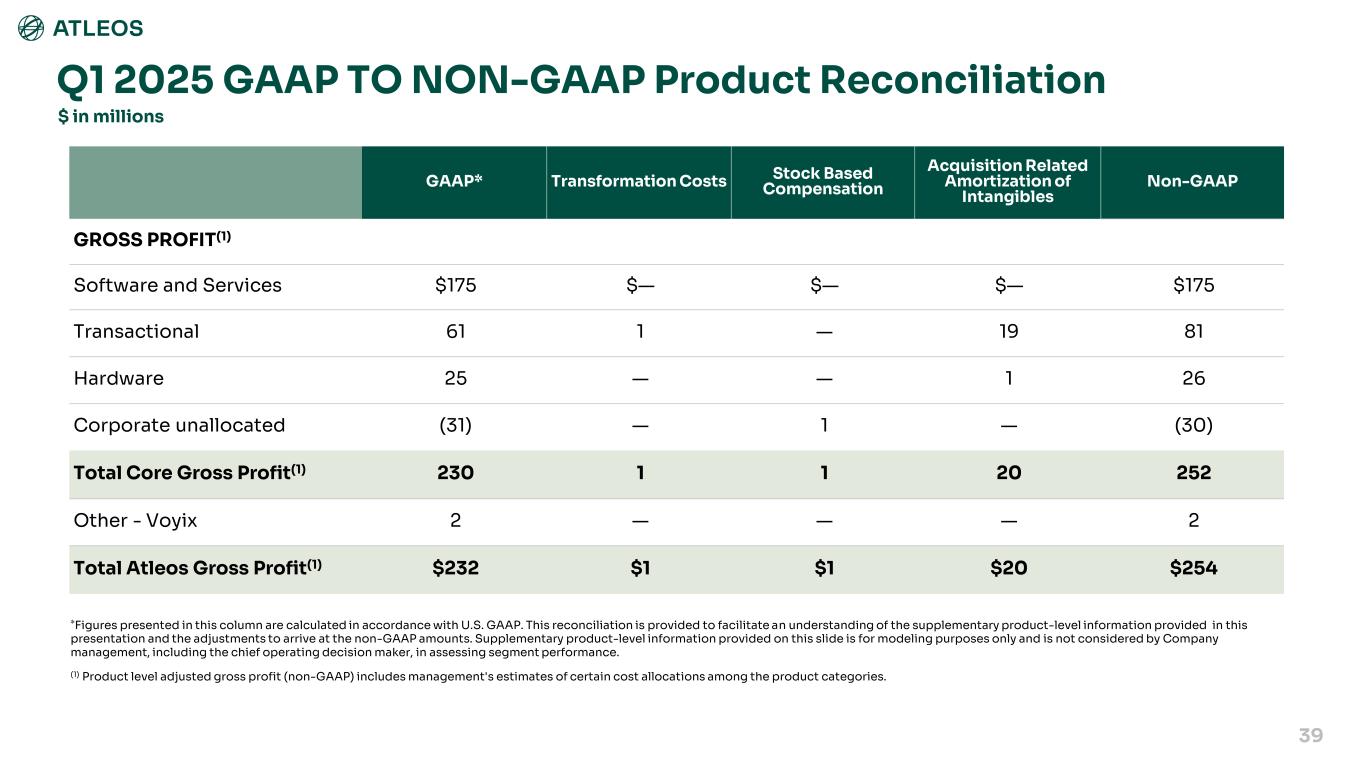 GAAP* Transformation Costs Stock Based Compensation Acquisition Related Amortization of Intangibles Non-GAAP GROSS PROFIT(1) Software and Services $185 $— $— $— $185 Transactional 58 (1) — 19 76 Hardware 43 2 — 1 46 Corporate unallocated (34) (1) 2 — (33) Total Core Gross Profit(1) 252 — 2 20 274 Other - Voyix — — — — — Total Atleos Gross Profit(1) $252 $— $2 $20 $274 Q2 2025 GAAP TO NON-GAAP Product Reconciliation $ in millions 38 *Figures presented in this column are calculated in accordance with U.S. GAAP. This reconciliation is provided to facilitate an understanding of the supplementary product-level information provided in this presentation and the adjustments to arrive at the non-GAAP amounts. Supplementary product-level information provided on this slide is for modeling purposes only and is not considered by Company management, including the chief operating decision maker, in assessing segment performance. (1) Product level adjusted gross profit (non-GAAP) includes management's estimates of certain cost allocations among the product categories.