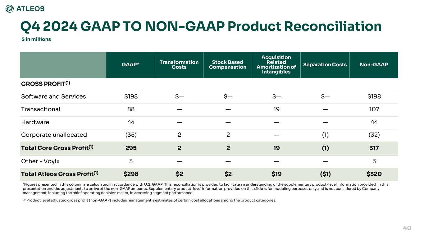GAAP* Transformation Costs Stock Based Compensation Acquisition Related Amortization of Intangibles Non-GAAP GROSS PROFIT(1) Software and Services $175 $— $— $— $175 Transactional 61 1 — 19 81 Hardware 25 — — 1 26 Corporate unallocated (31) — 1 — (30) Total Core Gross Profit(1) 230 1 1 20 252 Other - Voyix 2 — — — 2 Total Atleos Gross Profit(1) $232 $1 $1 $20 $254 Q1 2025 GAAP TO NON-GAAP Product Reconciliation $ in millions 39 *Figures presented in this column are calculated in accordance with U.S. GAAP. This reconciliation is provided to facilitate an understanding of the supplementary product-level information provided in this presentation and the adjustments to arrive at the non-GAAP amounts. Supplementary product-level information provided on this slide is for modeling purposes only and is not considered by Company management, including the chief operating decision maker, in assessing segment performance. (1) Product level adjusted gross profit (non-GAAP) includes management's estimates of certain cost allocations among the product categories.
