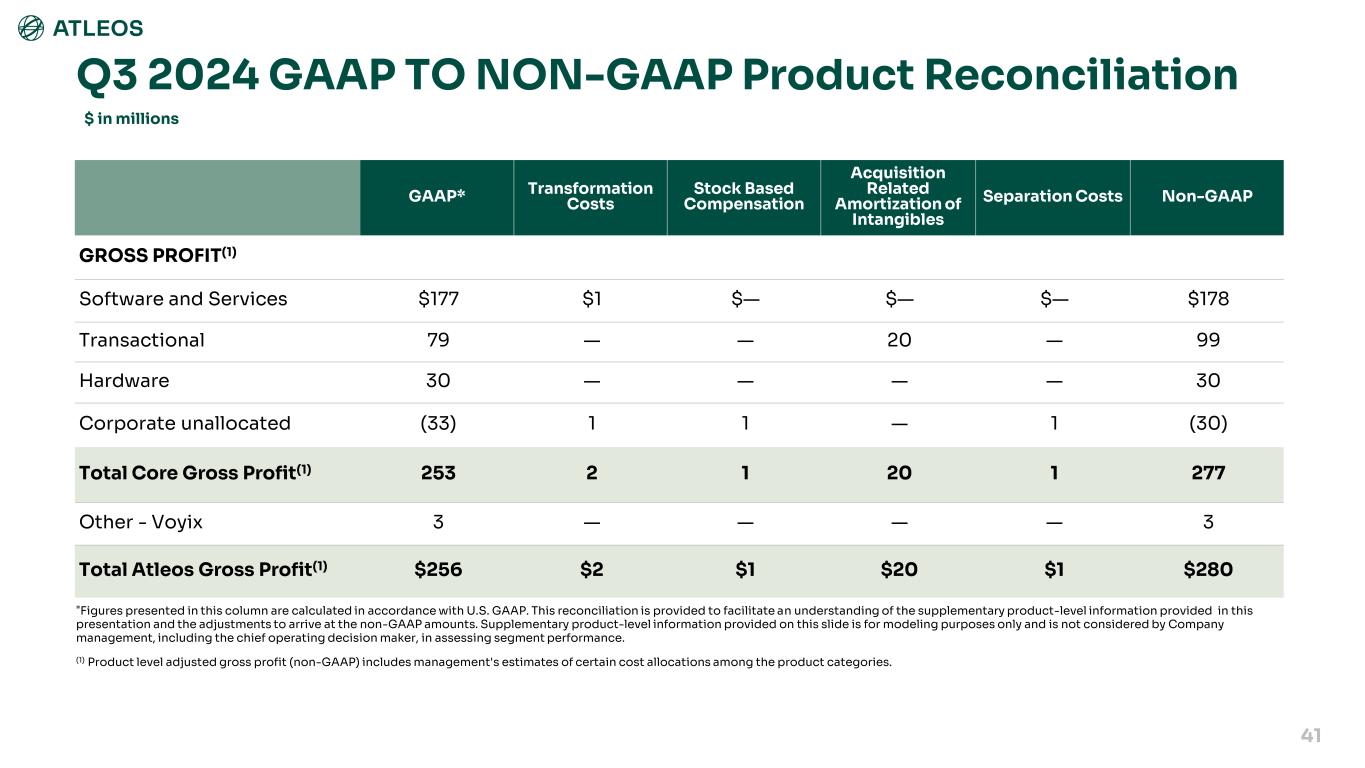 GAAP* Transformation Costs Stock Based Compensation Acquisition Related Amortization of Intangibles Separation Costs Non-GAAP GROSS PROFIT(1) Software and Services $198 $— $— $— $— $198 Transactional 88 — — 19 — 107 Hardware 44 — — — — 44 Corporate unallocated (35) 2 2 — (1) (32) Total Core Gross Profit(1) 295 2 2 19 (1) 317 Other - Voyix 3 — — — — 3 Total Atleos Gross Profit(1) $298 $2 $2 $19 ($1) $320 Q4 2024 GAAP TO NON-GAAP Product Reconciliation $ in millions 40 *Figures presented in this column are calculated in accordance with U.S. GAAP. This reconciliation is provided to facilitate an understanding of the supplementary product-level information provided in this presentation and the adjustments to arrive at the non-GAAP amounts. Supplementary product-level information provided on this slide is for modeling purposes only and is not considered by Company management, including the chief operating decision maker, in assessing segment performance. (1) Product level adjusted gross profit (non-GAAP) includes management's estimates of certain cost allocations among the product categories.