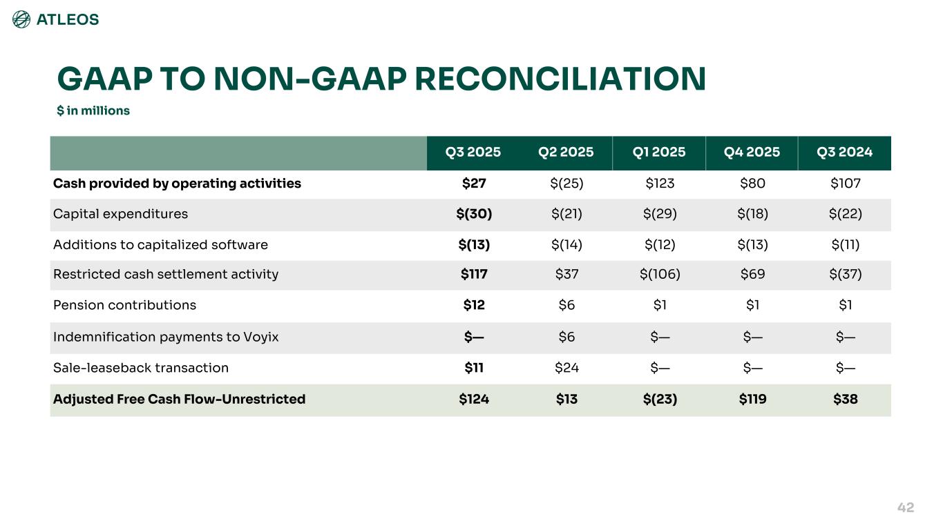 Q3 2025 Q2 2025 Q1 2025 Q4 2025 Q3 2024 Cash provided by operating activities $27 $(25) $123 $80 $107 Capital expenditures $(30) $(21) $(29) $(18) $(22) Additions to capitalized software $(13) $(14) $(12) $(13) $(11) Restricted cash settlement activity $117 $37 $(106) $69 $(37) Pension contributions $12 $6 $1 $1 $1 Indemnification payments to Voyix $— $6 $— $— $— Sale-leaseback transaction $11 $24 $— $— $— Adjusted Free Cash Flow-Unrestricted $124 $13 $(23) $119 $38 $ in millions GAAP TO NON-GAAP RECONCILIATION 42