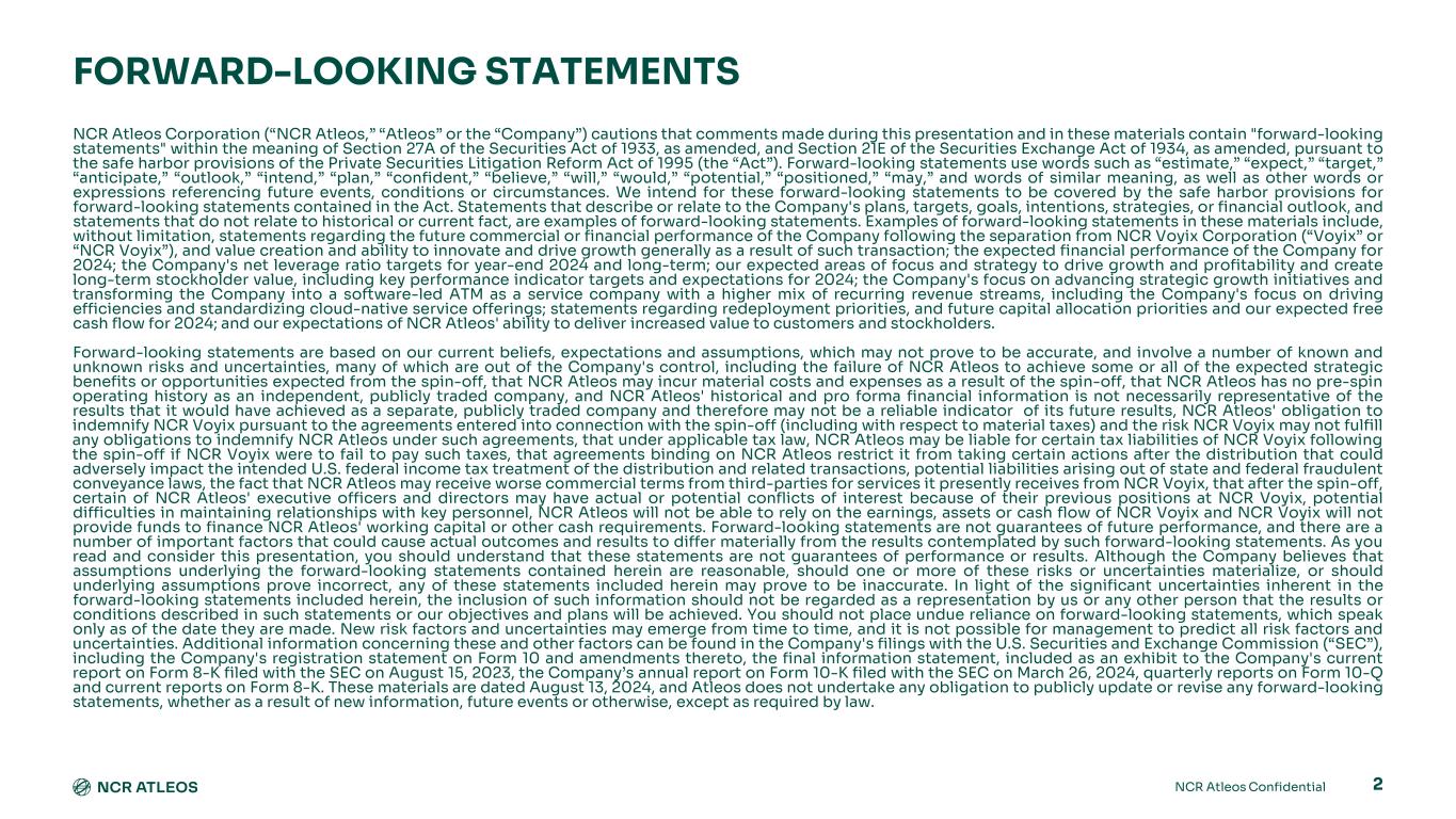 FORWARD-LOOKING STATEMENTS NCR Atleos Confidential 2 NCR Atleos Corporation (“NCR Atleos,” “Atleos” or the “Company”) cautions that comments made during this presentation and in these materials contain "forward-looking statements" within the meaning of Section 27A of the Securities Act of 1933, as amended, and Section 21E of the Securities Exchange Act of 1934, as amended, pursuant to the safe harbor provisions of the Private Securities Litigation Reform Act of 1995 (the “Act”). Forward-looking statements use words such as “estimate,” “expect,” “target,” “anticipate,” “outlook,” “intend,” “plan,” “confident,” “believe,” “will,” “would,” “potential,” “positioned,” “may,” and words of similar meaning, as well as other words or expressions referencing future events, conditions or circumstances. We intend for these forward-looking statements to be covered by the safe harbor provisions for forward-looking statements contained in the Act. Statements that describe or relate to the Company's plans, targets, goals, intentions, strategies, or financial outlook, and statements that do not relate to historical or current fact, are examples of forward-looking statements. Examples of forward-looking statements in these materials include, without limitation, statements regarding the future commercial or financial performance of the Company following the separation from NCR Voyix Corporation (“Voyix” or “NCR Voyix”), and value creation and ability to innovate and drive growth generally as a result of such transaction; the expected financial performance of the Company for 2024; the Company's net leverage ratio targets for year-end 2024 and long-term; our expected areas of focus and strategy to drive growth and profitability and create long-term stockholder value, including key performance indicator targets and expectations for 2024; the Company's focus on advancing strategic growth initiatives and transforming the Company into a software-led ATM as a service company with a higher mix of recurring revenue streams, including the Company's focus on driving efficiencies and standardizing cloud-native service offerings; statements regarding redeployment priorities, and future capital allocation priorities and our expected free cash flow for 2024; and our expectations of NCR Atleos' ability to deliver increased value to customers and stockholders. Forward-looking statements are based on our current beliefs, expectations and assumptions, which may not prove to be accurate, and involve a number of known and unknown risks and uncertainties, many of which are out of the Company's control, including the failure of NCR Atleos to achieve some or all of the expected strategic benefits or opportunities expected from the spin-off, that NCR Atleos may incur material costs and expenses as a result of the spin-off, that NCR Atleos has no pre-spin operating history as an independent, publicly traded company, and NCR Atleos' historical and pro forma financial information is not necessarily representative of the results that it would have achieved as a separate, publicly traded company and therefore may not be a reliable indicator of its future results, NCR Atleos' obligation to indemnify NCR Voyix pursuant to the agreements entered into connection with the spin-off (including with respect to material taxes) and the risk NCR Voyix may not fulfill any obligations to indemnify NCR Atleos under such agreements, that under applicable tax law, NCR Atleos may be liable for certain tax liabilities of NCR Voyix following the spin-off if NCR Voyix were to fail to pay such taxes, that agreements binding on NCR Atleos restrict it from taking certain actions after the distribution that could adversely impact the intended U.S. federal income tax treatment of the distribution and related transactions, potential liabilities arising out of state and federal fraudulent conveyance laws, the fact that NCR Atleos may receive worse commercial terms from third-parties for services it presently receives from NCR Voyix, that after the spin-off, certain of NCR Atleos' executive officers and directors may have actual or potential conflicts of interest because of their previous positions at NCR Voyix, potential difficulties in maintaining relationships with key personnel, NCR Atleos will not be able to rely on the earnings, assets or cash flow of NCR Voyix and NCR Voyix will not provide funds to finance NCR Atleos' working capital or other cash requirements. Forward-looking statements are not guarantees of future performance, and there are a number of important factors that could cause actual outcomes and results to differ materially from the results contemplated by such forward-looking statements. As you read and consider this presentation, you should understand that these statements are not guarantees of performance or results. Although the Company believes that assumptions underlying the forward-looking statements contained herein are reasonable, should one or more of these risks or uncertainties materialize, or should underlying assumptions prove incorrect, any of these statements included herein may prove to be inaccurate. In light of the significant uncertainties inherent in the forward-looking statements included herein, the inclusion of such information should not be regarded as a representation by us or any other person that the results or conditions described in such statements or our objectives and plans will be achieved. You should not place undue reliance on forward-looking statements, which speak only as of the date they are made. New risk factors and uncertainties may emerge from time to time, and it is not possible for management to predict all risk factors and uncertainties. Additional information concerning these and other factors can be found in the Company's filings with the U.S. Securities and Exchange Commission (“SEC”), including the Company's reg