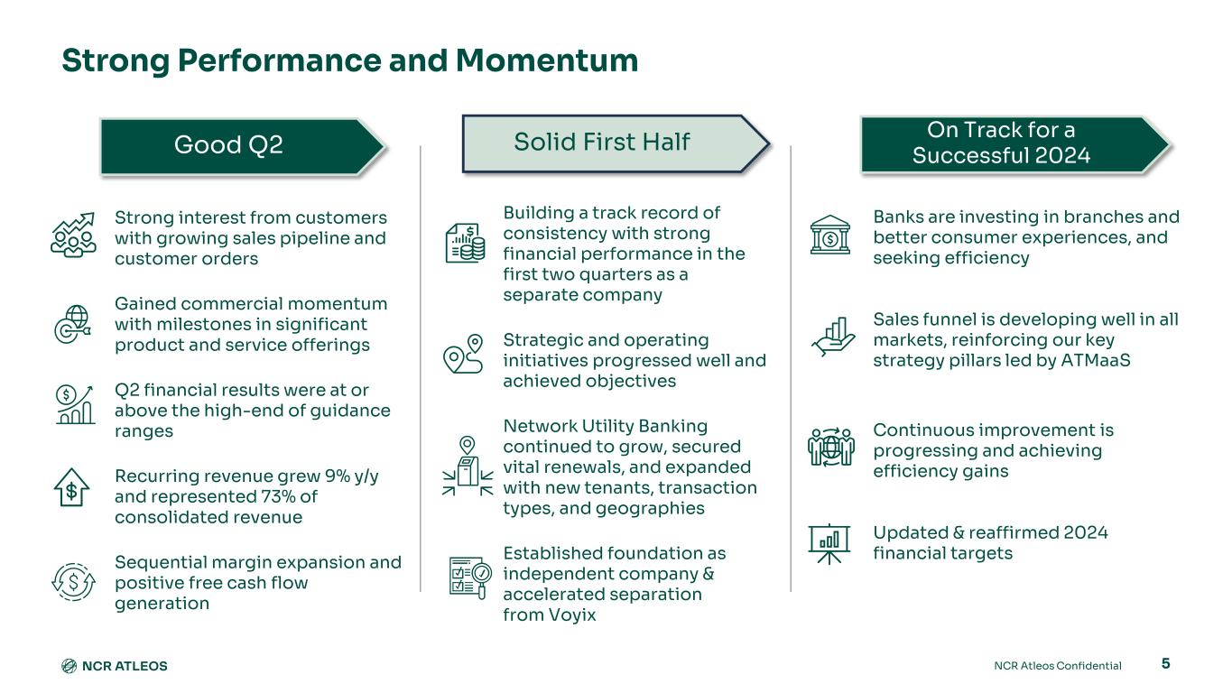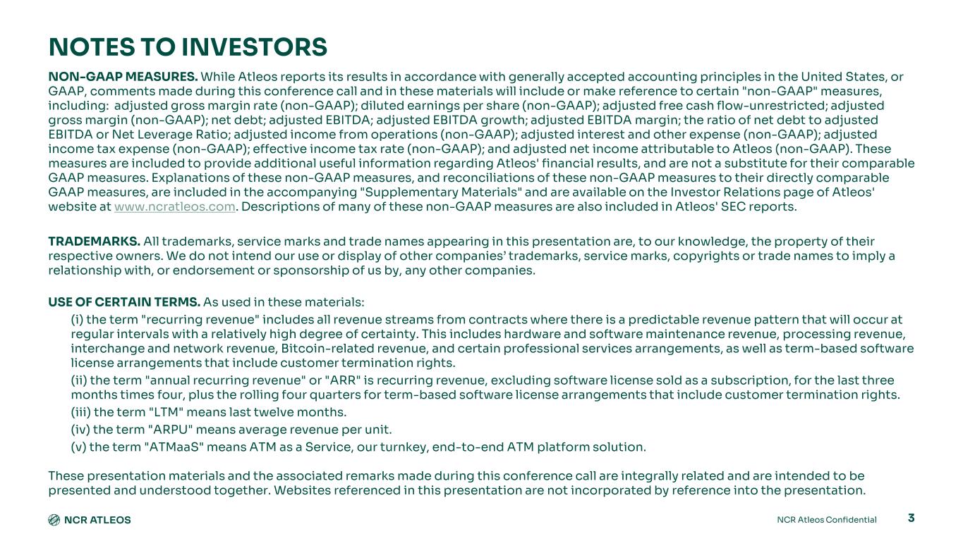 NOTES TO INVESTORS NON-GAAP MEASURES. While Atleos reports its results in accordance with generally accepted accounting principles in the United States, or GAAP, comments made during this conference call and in these materials will include or make reference to certain "non-GAAP" measures, including: adjusted gross margin rate (non-GAAP); diluted earnings per share (non-GAAP); adjusted free cash flow-unrestricted; adjusted gross margin (non-GAAP); net debt; adjusted EBITDA; adjusted EBITDA growth; adjusted EBITDA margin; the ratio of net debt to adjusted EBITDA or Net Leverage Ratio; adjusted income from operations (non-GAAP); adjusted interest and other expense (non-GAAP); adjusted income tax expense (non-GAAP); effective income tax rate (non-GAAP); and adjusted net income attributable to Atleos (non-GAAP). These measures are included to provide additional useful information regarding Atleos' financial results, and are not a substitute for their comparable GAAP measures. Explanations of these non-GAAP measures, and reconciliations of these non-GAAP measures to their directly comparable GAAP measures, are included in the accompanying "Supplementary Materials" and are available on the Investor Relations page of Atleos' website at www.ncratleos.com. Descriptions of many of these non-GAAP measures are also included in Atleos' SEC reports. TRADEMARKS. All trademarks, service marks and trade names appearing in this presentation are, to our knowledge, the property of their respective owners. We do not intend our use or display of other companies’ trademarks, service marks, copyrights or trade names to imply a relationship with, or endorsement or sponsorship of us by, any other companies. USE OF CERTAIN TERMS. As used in these materials: (i) the term "recurring revenue" includes all revenue streams from contracts where there is a predictable revenue pattern that will occur at regular intervals with a relatively high degree of certainty. This includes hardware and software maintenance revenue, processing revenue, interchange and network revenue, Bitcoin-related revenue, and certain professional services arrangements, as well as term-based software license arrangements that include customer termination rights. (ii) the term "annual recurring revenue" or "ARR" is recurring revenue, excluding software license sold as a subscription, for the last three months times four, plus the rolling four quarters for term-based software license arrangements that include customer termination rights. (iii) the term "LTM" means last twelve months. (iv) the term "ARPU" means average revenue per unit. (v) the term "ATMaaS" means ATM as a Service, our turnkey, end-to-end ATM platform solution. These presentation materials and the associated remarks made during this conference call are integrally related and are intended to be presented and understood together. Websites referenced in this presentation are not incorporated by reference into the presentation. NCR Atleos Confidential 3