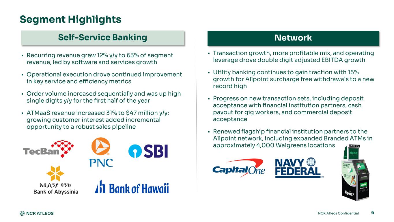 Good Q2 Solid First Half On Track for a Successful 2024 Building a track record of consistency with strong financial performance in the first two quarters as a separate company Strategic and operating initiatives progressed well and achieved objectives Network Utility Banking continued to grow, secured vital renewals, and expanded with new tenants, transaction types, and geographies Established foundation as independent company & accelerated separation from Voyix Strong interest from customers with growing sales pipeline and customer orders Gained commercial momentum with milestones in significant product and service offerings Q2 financial results were at or above the high-end of guidance ranges Recurring revenue grew 9% y/y and represented 73% of consolidated revenue Sequential margin expansion and positive free cash flow generation Banks are investing in branches and better consumer experiences, and seeking efficiency Sales funnel is developing well in all markets, reinforcing our key strategy pillars led by ATMaaS Continuous improvement is progressing and achieving efficiency gains Updated & reaffirmed 2024 financial targets Strong Performance and Momentum NCR Atleos Confidential 5