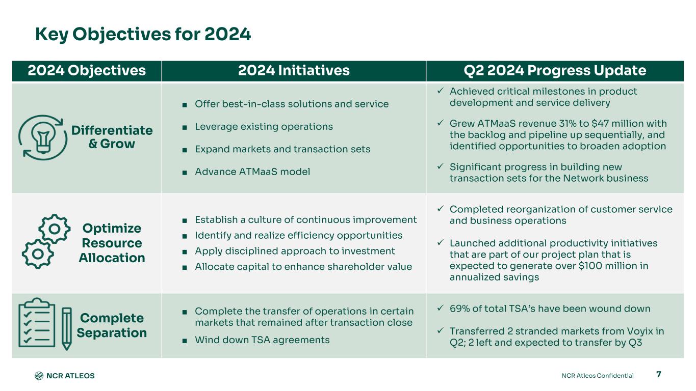 • Recurring revenue grew 12% y/y to 63% of segment revenue, led by software and services growth • Operational execution drove continued improvement in key service and efficiency metrics • Order volume increased sequentially and was up high single digits y/y for the first half of the year • ATMaaS revenue increased 31% to $47 million y/y; growing customer interest added incremental opportunity to a robust sales pipeline • Transaction growth, more profitable mix, and operating leverage drove double digit adjusted EBITDA growth • Utility banking continues to gain traction with 15% growth for Allpoint surcharge free withdrawals to a new record high • Progress on new transaction sets, including deposit acceptance with financial institution partners, cash payout for gig workers, and commercial deposit acceptance • Renewed flagship financial institution partners to the Allpoint network, including expanded Branded ATMs in approximately 4,000 Walgreens locations Self-Service Banking Network Segment Highlights NCR Atleos Confidential 6
