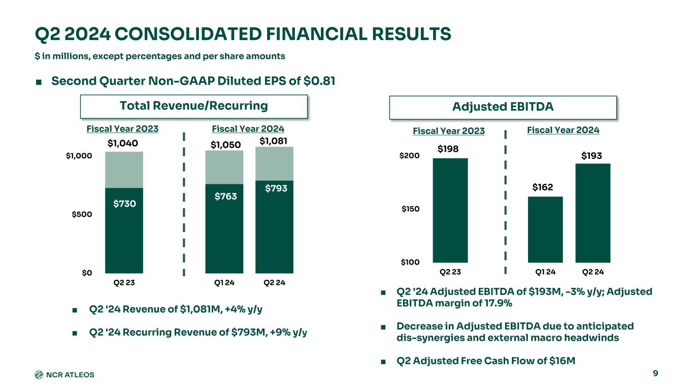 Q2 2024 Q2 2023 % Change Revenue $1,081 $1,040 4% Adjusted Gross Margin (non-GAAP) 276 270 2% Adjusted Gross Margin Rate (non-GAAP) 25.5% 26.0% Adjusted Operating Expenses (non-GAAP) 124 109 14% % of Revenue 11.5% 10.5% Adjusted Income from Operations (non-GAAP) 152 161 (6)% % of Revenue (Adjusted Operating Margin Rate) 14.1% 15.5% Adjusted Interest and other expense (non-GAAP) (80) (4) 1,900% Adjusted Income Tax Expense (non-GAAP) 13 40 (68)% Adjusted Effective Income Tax Rate (non-GAAP) 18.1% 25.5% Adjusted Net Income attributable to Atleos (non-GAAP) $60 $118 (49)% Diluted EPS attributable to Atleos (non-GAAP) $0.81 $1.67 (51)% $ in millions, except per share amounts Q2 2024 OPERATIONAL RESULTS (Non-GAAP) 25