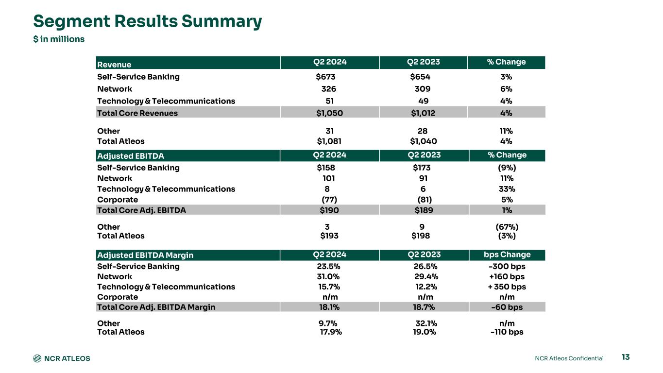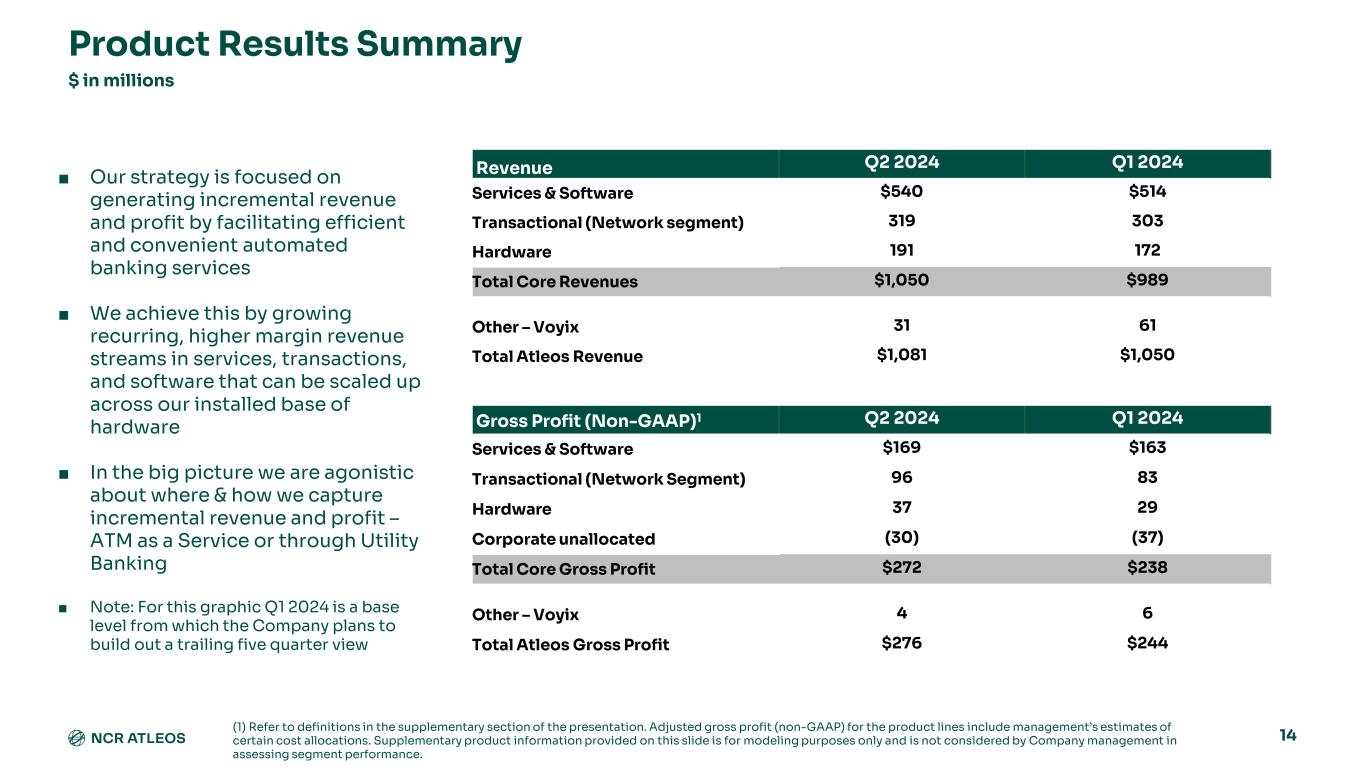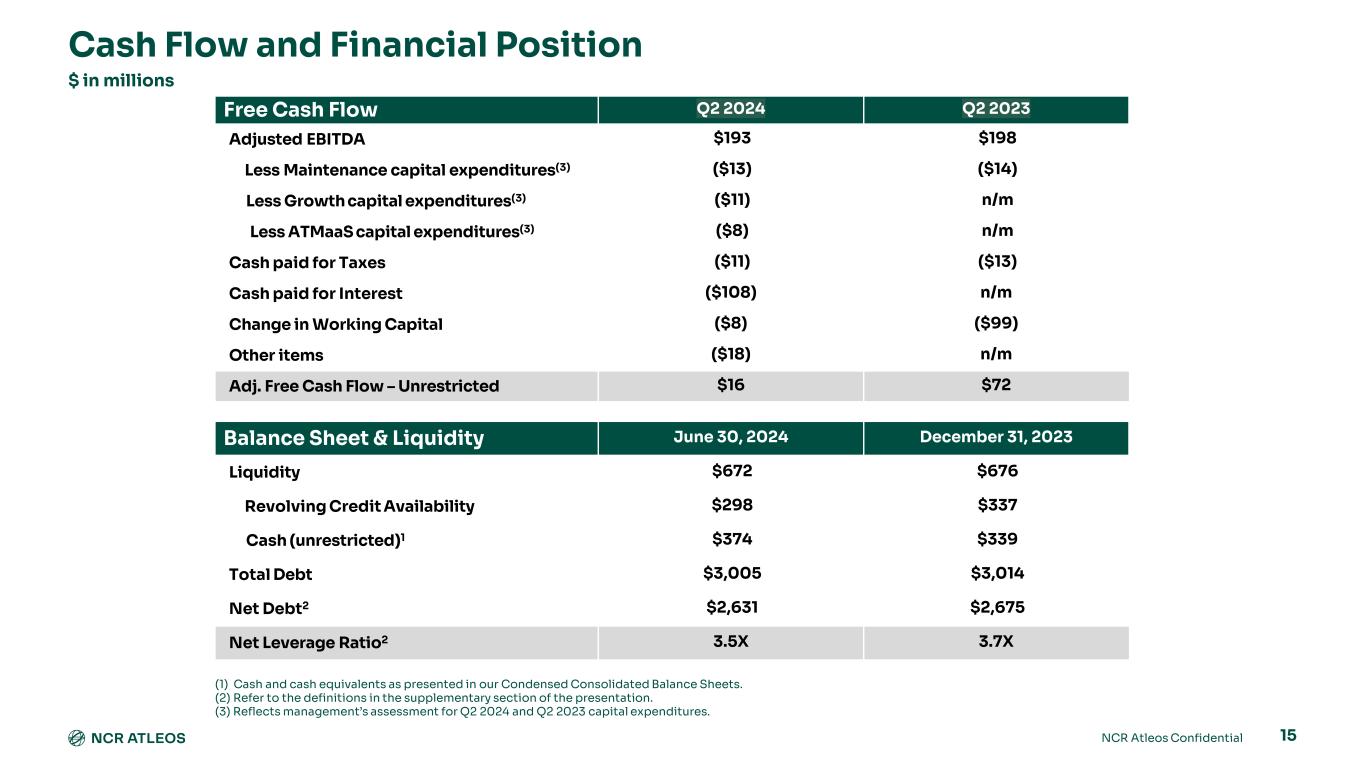 Segment Results Summary $ in millions NCR Atleos Confidential 13 Revenue Q2 2024 Q2 2023 % Change Self-Service Banking $673 $654 3% Network 326 309 6% Technology & Telecommunications 51 49 4% Total Core Revenues $1,050 $1,012 4% Other 31 28 11% Total Atleos $1,081 $1,040 4% Adjusted EBITDA Q2 2024 Q2 2023 % Change Self-Service Banking $158 $173 (9%) Network 101 91 11% Technology & Telecommunications 8 6 33% Corporate (77) (81) 5% Total Core Adj. EBITDA $190 $189 1% Other 3 9 (67%) Total Atleos $193 $198 (3%) Adjusted EBITDA Margin Q2 2024 Q2 2023 bps Change Self-Service Banking 23.5% 26.5% -300 bps Network 31.0% 29.4% +160 bps Technology & Telecommunications 15.7% 12.2% + 350 bps Corporate n/m n/m n/m Total Core Adj. EBITDA Margin 18.1% 18.7% -60 bps Other 9.7% 32.1% n/m Total Atleos 17.9% 19.0% -110 bps