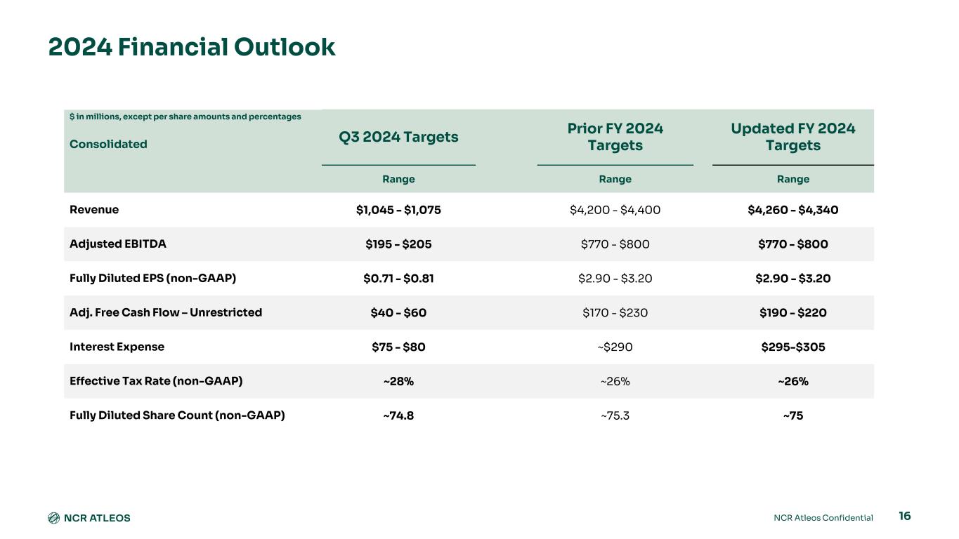 (1) Cash and cash equivalents as presented in our Condensed Consolidated Balance Sheets. (2) Refer to the definitions in the supplementary section of the presentation. (3) Reflects management’s assessment for Q2 2024 and Q2 2023 capital expenditures. Balance Sheet & Liquidity June 30, 2024 December 31, 2023 Liquidity $672 $676 Revolving Credit Availability $298 $337 Cash (unrestricted)1 $374 $339 Total Debt $3,005 $3,014 Net Debt2 $2,631 $2,675 Net Leverage Ratio2 3.5X 3.7X Free Cash Flow Q2 2024 Q2 2023 Adjusted EBITDA $193 $198 Less Maintenance capital expenditures(3) ($13) ($14) Less Growth capital expenditures(3) ($11) n/m Less ATMaaS capital expenditures(3) ($8) n/m Cash paid for Taxes ($11) ($13) Cash paid for Interest ($108) n/m Change in Working Capital ($8) ($99) Other items ($18) n/m Adj. Free Cash Flow – Unrestricted $16 $72 Cash Flow and Financial Position NCR Atleos Confidential 15 $ in millions