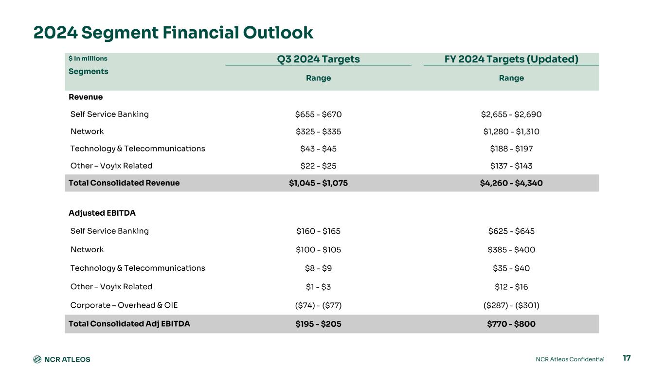 2024 Financial Outlook 16NCR Atleos Confidential $ in millions, except per share amounts and percentages Q3 2024 Targets Prior FY 2024 Targets Updated FY 2024 TargetsConsolidated Range Range Range Revenue $1,045 - $1,075 $4,200 - $4,400 $4,260 - $4,340 Adjusted EBITDA $195 - $205 $770 - $800 $770 - $800 Fully Diluted EPS (non-GAAP) $0.71 - $0.81 $2.90 - $3.20 $2.90 - $3.20 Adj. Free Cash Flow – Unrestricted $40 - $60 $170 - $230 $190 - $220 Interest Expense $75 - $80 ~$290 $295-$305 Effective Tax Rate (non-GAAP) ~28% ~26% ~26% Fully Diluted Share Count (non-GAAP) ~74.8 ~75.3 ~75