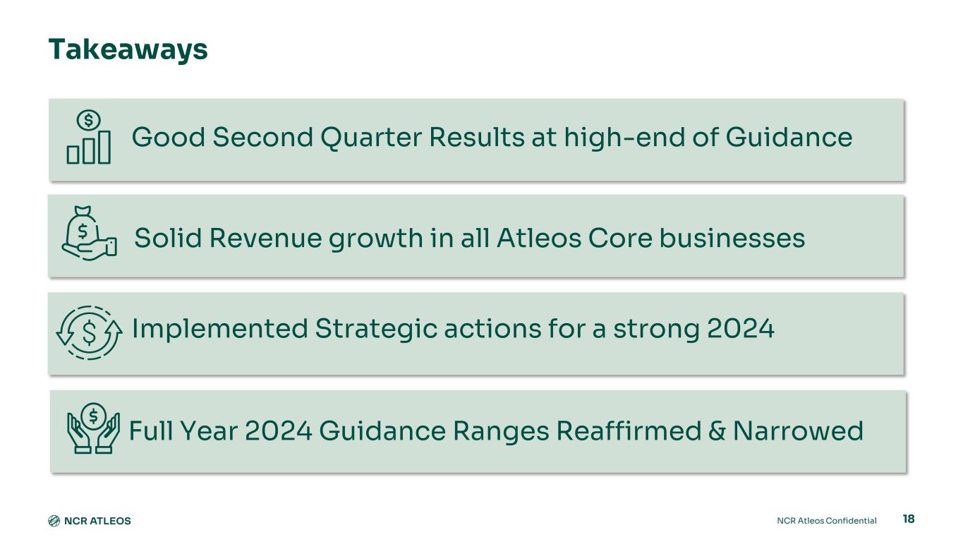 2024 Segment Financial Outlook NCR Atleos Confidential 17 $ In millions Q3 2024 Targets FY 2024 Targets (Updated) Segments Range Range Revenue Self Service Banking $655 - $670 $2,655 - $2,690 Network $325 - $335 $1,280 - $1,310 Technology & Telecommunications $43 - $45 $188 - $197 Other – Voyix Related $22 - $25 $137 - $143 Total Consolidated Revenue $1,045 - $1,075 $4,260 - $4,340 Adjusted EBITDA Self Service Banking $160 - $165 $625 - $645 Network $100 - $105 $385 - $400 Technology & Telecommunications $8 - $9 $35 - $40 Other – Voyix Related $1 - $3 $12 - $16 Corporate – Overhead & OIE ($74) - ($77) ($287) - ($301) Total Consolidated Adj EBITDA $195 - $205 $770 - $800