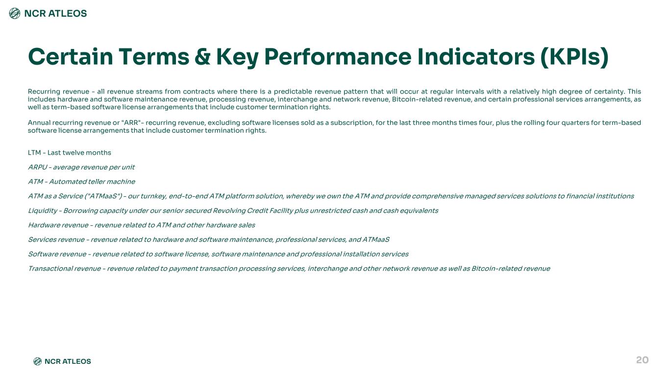 Recurring revenue - all revenue streams from contracts where there is a predictable revenue pattern that will occur at regular intervals with a relatively high degree of certainty. This includes hardware and software maintenance revenue, processing revenue, interchange and network revenue, Bitcoin-related revenue, and certain professional services arrangements, as well as term-based software license arrangements that include customer termination rights. Annual recurring revenue or "ARR"- recurring revenue, excluding software licenses sold as a subscription, for the last three months times four, plus the rolling four quarters for term-based software license arrangements that include customer termination rights. LTM - Last twelve months ARPU - average revenue per unit ATM - Automated teller machine ATM as a Service ("ATMaaS") - our turnkey, end-to-end ATM platform solution, whereby we own the ATM and provide comprehensive managed services solutions to financial institutions Liquidity - Borrowing capacity under our senior secured Revolving Credit Facility plus unrestricted cash and cash equivalents Hardware revenue - revenue related to ATM and other hardware sales Services revenue - revenue related to hardware and software maintenance, professional services, and ATMaaS Software revenue - revenue related to software license, software maintenance and professional installation services Transactional revenue - revenue related to payment transaction processing services, interchange and other network revenue as well as Bitcoin-related revenue Certain Terms & Key Performance Indicators (KPIs) 20