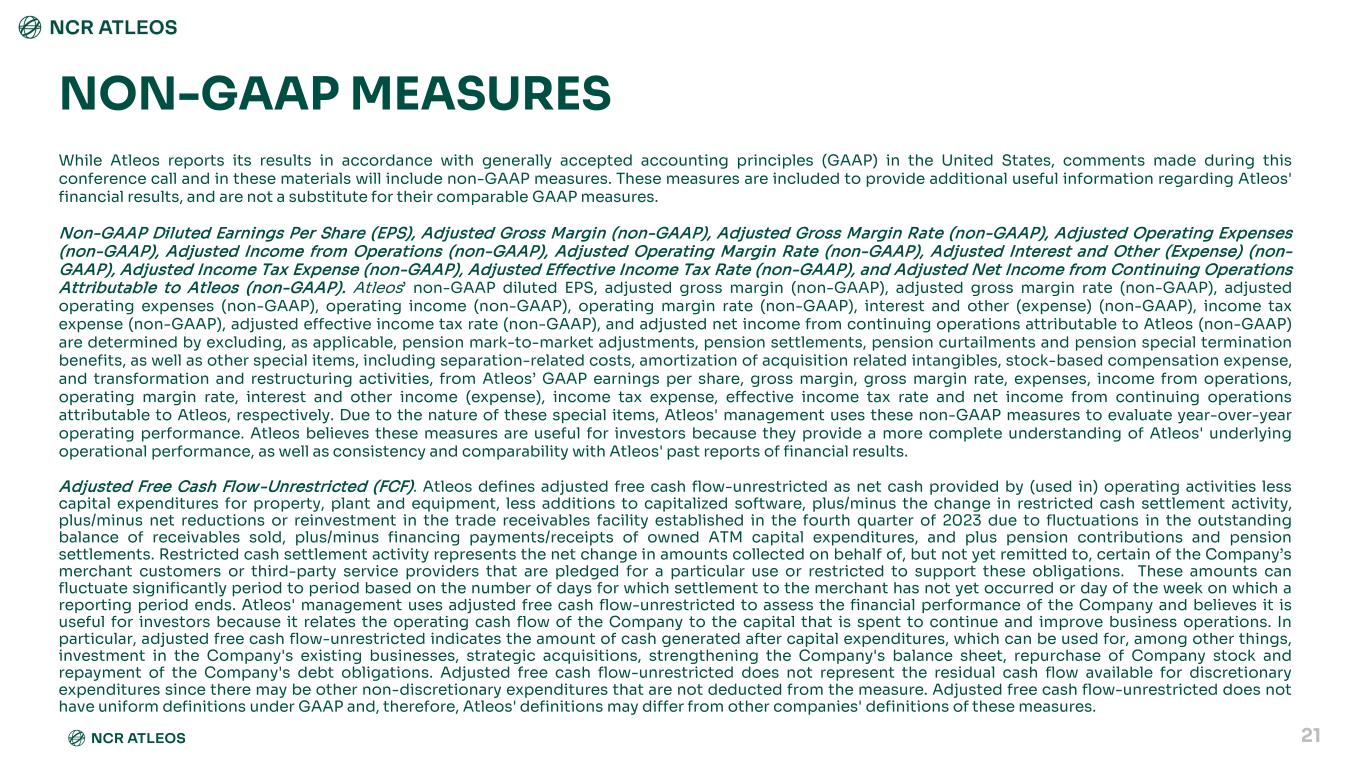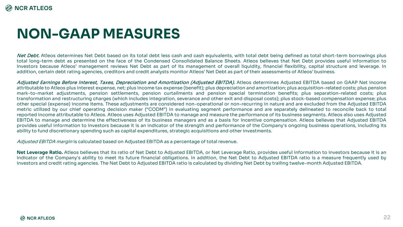 While Atleos reports its results in accordance with generally accepted accounting principles (GAAP) in the United States, comments made during this conference call and in these materials will include non-GAAP measures. These measures are included to provide additional useful information regarding Atleos' financial results, and are not a substitute for their comparable GAAP measures. Non-GAAP Diluted Earnings Per Share (EPS), Adjusted Gross Margin (non-GAAP), Adjusted Gross Margin Rate (non-GAAP), Adjusted Operating Expenses (non-GAAP), Adjusted Income from Operations (non-GAAP), Adjusted Operating Margin Rate (non-GAAP), Adjusted Interest and Other (Expense) (non- GAAP), Adjusted Income Tax Expense (non-GAAP), Adjusted Effective Income Tax Rate (non-GAAP), and Adjusted Net Income from Continuing Operations Attributable to Atleos (non-GAAP). Atleos’ non-GAAP diluted EPS, adjusted gross margin (non-GAAP), adjusted gross margin rate (non-GAAP), adjusted operating expenses (non-GAAP), operating income (non-GAAP), operating margin rate (non-GAAP), interest and other (expense) (non-GAAP), income tax expense (non-GAAP), adjusted effective income tax rate (non-GAAP), and adjusted net income from continuing operations attributable to Atleos (non-GAAP) are determined by excluding, as applicable, pension mark-to-market adjustments, pension settlements, pension curtailments and pension special termination benefits, as well as other special items, including separation-related costs, amortization of acquisition related intangibles, stock-based compensation expense, and transformation and restructuring activities, from Atleos’ GAAP earnings per share, gross margin, gross margin rate, expenses, income from operations, operating margin rate, interest and other income (expense), income tax expense, effective income tax rate and net income from continuing operations attributable to Atleos, respectively. Due to the nature of these special items, Atleos' management uses these non-GAAP measures to evaluate year-over-year operating performance. Atleos believes these measures are useful for investors because they provide a more complete understanding of Atleos' underlying operational performance, as well as consistency and comparability with Atleos' past reports of financial results. Adjusted Free Cash Flow-Unrestricted (FCF). Atleos defines adjusted free cash flow-unrestricted as net cash provided by (used in) operating activities less capital expenditures for property, plant and equipment, less additions to capitalized software, plus/minus the change in restricted cash settlement activity, plus/minus net reductions or reinvestment in the trade receivables facility established in the fourth quarter of 2023 due to fluctuations in the outstanding balance of receivables sold, plus/minus financing payments/receipts of owned ATM capital expenditures, and plus pension contributions and pension settlements. Restricted cash settlement activity represents the net change in amounts collected on behalf of, but not yet remitted to, certain of the Company’s merchant customers or third-party service providers that are pledged for a particular use or restricted to support these obligations. These amounts can fluctuate significantly period to period based on the number of days for which settlement to the merchant has not yet occurred or day of the week on which a reporting period ends. Atleos' management uses adjusted free cash flow-unrestricted to assess the financial performance of the Company and believes it is useful for investors because it relates the operating cash flow of the Company to the capital that is spent to continue and improve business operations. In particular, adjusted free cash flow-unrestricted indicates the amount of cash generated after capital expenditures, which can be used for, among other things, investment in the Company's existing businesses, strategic acquisitions, strengthening the Company's balance sheet, repurchase of Company stock and repayment of the Company's debt obligations. Adjusted free cash flow-unrestricted does not represent the residual cash flow available for discretionary expenditures since there may be other non-discretionary expenditures that are not deducted from the measure. Adjusted free cash flow-unrestricted does not have uniform definitions under GAAP and, therefore, Atleos' definitions may differ from other companies' definitions of these measures. NON-GAAP MEASURES 21