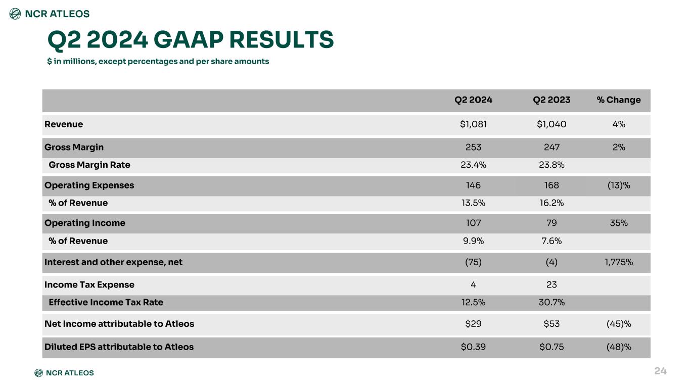 Q2 2024 Q2 2023 % Change Revenue $1,081 $1,040 4% Gross Margin 253 247 2% Gross Margin Rate 23.4% 23.8% Operating Expenses 146 168 (13)% % of Revenue 13.5% 16.2% Operating Income 107 79 35% % of Revenue 9.9% 7.6% Interest and other expense, net (75) (4) 1,775% Income Tax Expense 4 23 Effective Income Tax Rate 12.5% 30.7% Net Income attributable to Atleos $29 $53 (45)% Diluted EPS attributable to Atleos $0.39 $0.75 (48)% $ in millions, except percentages and per share amounts Q2 2024 GAAP RESULTS 24