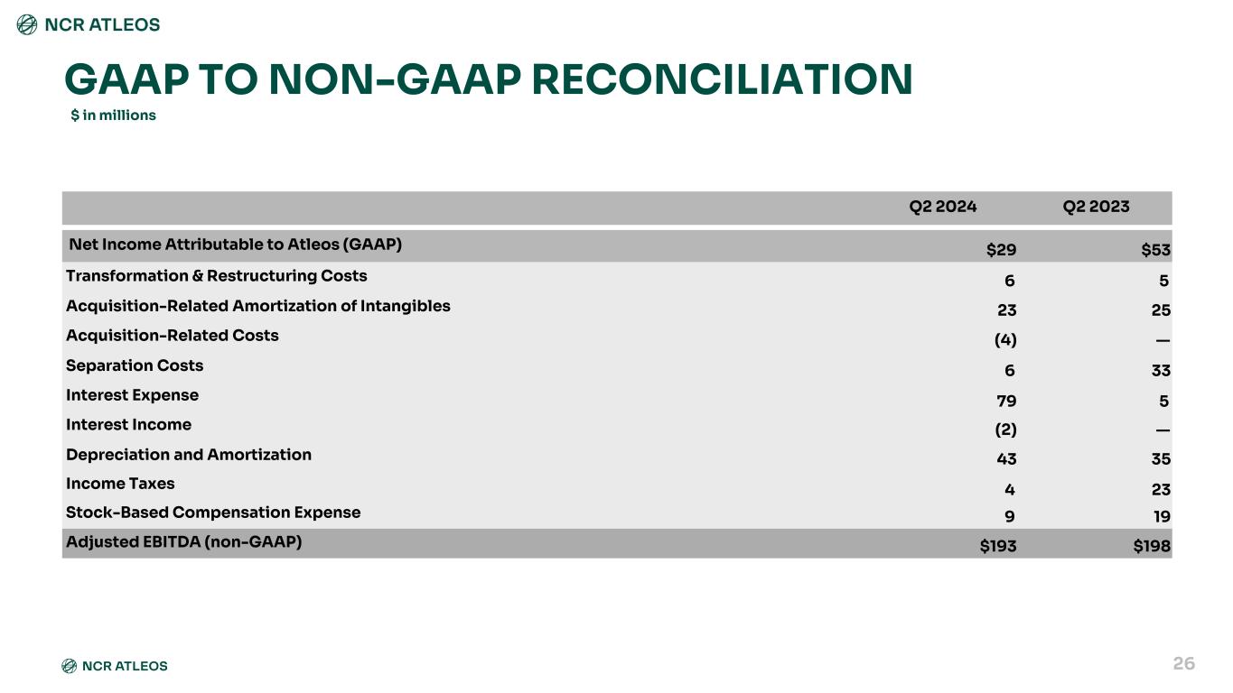 Q2 2024 Q2 2023 Net Income Attributable to Atleos (GAAP) $29 $53 Transformation & Restructuring Costs 6 5 Acquisition-Related Amortization of Intangibles 23 25 Acquisition-Related Costs (4) — Separation Costs 6 33 Interest Expense 79 5 Interest Income (2) — Depreciation and Amortization 43 35 Income Taxes 4 23 Stock-Based Compensation Expense 9 19 Adjusted EBITDA (non-GAAP) $193 $198 GAAP TO NON-GAAP RECONCILIATION $ in millions 26
