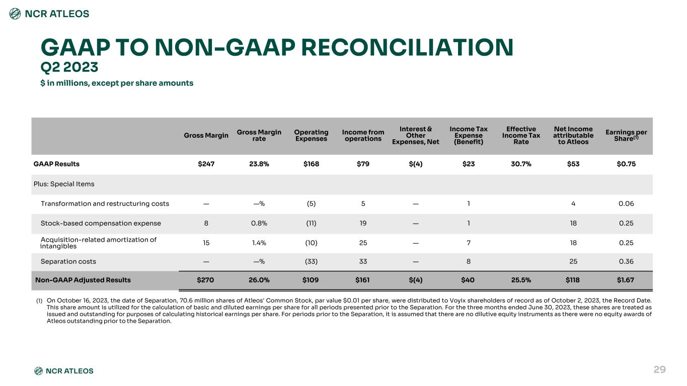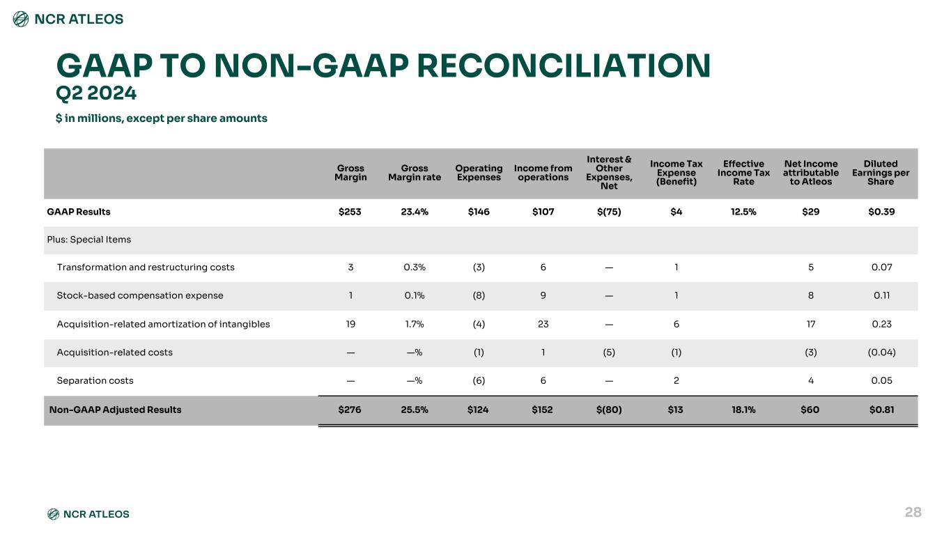GAAP TO NON-GAAP RECONCILIATION $ in millions, except per share amounts Gross Margin Gross Margin rate Operating Expenses Income from operations Interest & Other Expenses, Net Income Tax Expense (Benefit) Effective Income Tax Rate Net Income attributable to Atleos Diluted Earnings per Share GAAP Results $253 23.4% $146 $107 $(75) $4 12.5% $29 $0.39 Plus: Special Items Transformation and restructuring costs 3 0.3% (3) 6 — 1 5 0.07 Stock-based compensation expense 1 0.1% (8) 9 — 1 8 0.11 Acquisition-related amortization of intangibles 19 1.7% (4) 23 — 6 17 0.23 Acquisition-related costs — —% (1) 1 (5) (1) (3) (0.04) Separation costs — —% (6) 6 — 2 4 0.05 Non-GAAP Adjusted Results $276 25.5% $124 $152 $(80) $13 18.1% $60 $0.81 Q2 2024 28