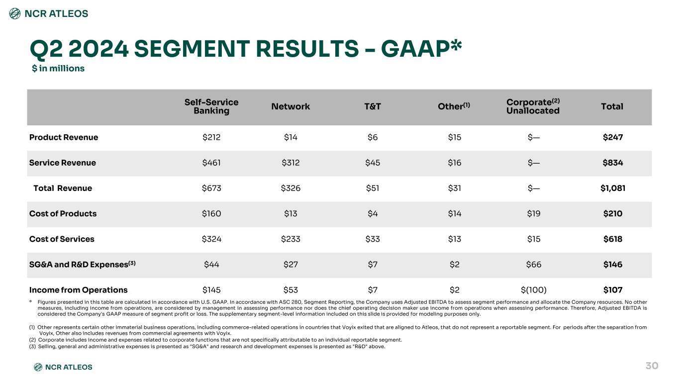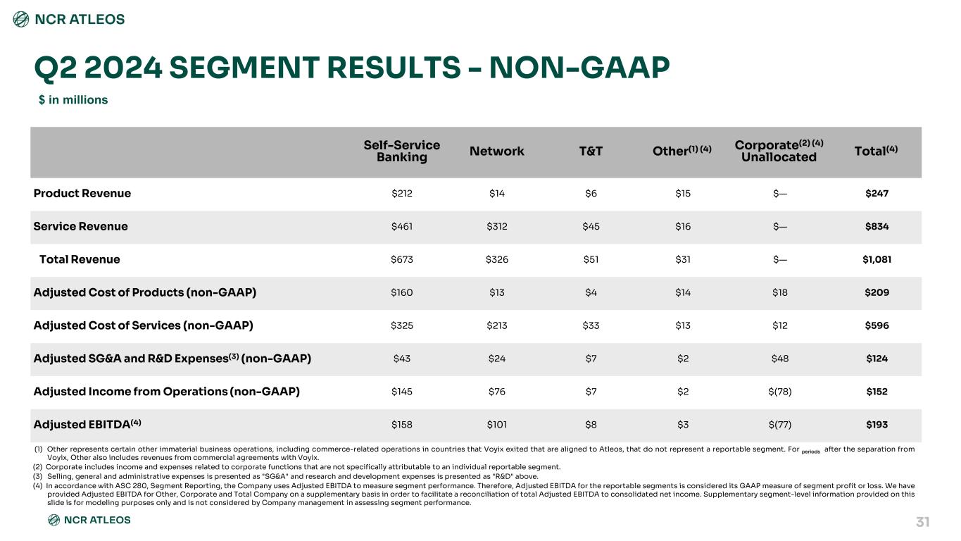 * Figures presented in this table are calculated in accordance with U.S. GAAP. In accordance with ASC 280, Segment Reporting, the Company uses Adjusted EBITDA to assess segment performance and allocate the Company resources. No other measures, including income from operations, are considered by management in assessing performance nor does the chief operating decision maker use income from operations when assessing performance. Therefore, Adjusted EBITDA is considered the Company's GAAP measure of segment profit or loss. The supplementary segment-level information included on this slide is provided for modeling purposes only. (1) Other represents certain other immaterial business operations, including commerce-related operations in countries that Voyix exited that are aligned to Atleos, that do not represent a reportable segment. For periods after the separation from Voyix, Other also includes revenues from commercial agreements with Voyix. (2) Corporate includes income and expenses related to corporate functions that are not specifically attributable to an individual reportable segment. (3) Selling, general and administrative expenses is presented as "SG&A" and research and development expenses is presented as "R&D" above. Self-Service Banking Network T&T Other(1) Corporate(2) Unallocated Total Product Revenue $212 $14 $6 $15 $— $247 Service Revenue $461 $312 $45 $16 $— $834 Total Revenue $673 $326 $51 $31 $— $1,081 Cost of Products $160 $13 $4 $14 $19 $210 Cost of Services $324 $233 $33 $13 $15 $618 SG&A and R&D Expenses(3) $44 $27 $7 $2 $66 $146 Income from Operations $145 $53 $7 $2 $(100) $107 Q2 2024 SEGMENT RESULTS - GAAP* $ in millions 30
