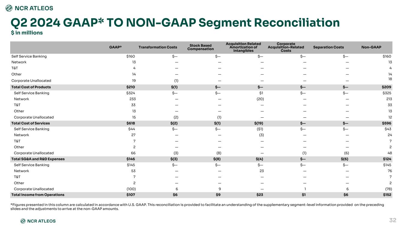 Self-Service Banking Network T&T Other(1) (4) Corporate(2) (4) Unallocated Total(4) Product Revenue $212 $14 $6 $15 $— $247 Service Revenue $461 $312 $45 $16 $— $834 Total Revenue $673 $326 $51 $31 $— $1,081 Adjusted Cost of Products (non-GAAP) $160 $13 $4 $14 $18 $209 Adjusted Cost of Services (non-GAAP) $325 $213 $33 $13 $12 $596 Adjusted SG&A and R&D Expenses(3) (non-GAAP) $43 $24 $7 $2 $48 $124 Adjusted Income from Operations (non-GAAP) $145 $76 $7 $2 $(78) $152 Adjusted EBITDA(4) $158 $101 $8 $3 $(77) $193 Q2 2024 SEGMENT RESULTS - NON-GAAP $ in millions 31 (1) Other represents certain other immaterial business operations, including commerce-related operations in countries that Voyix exited that are aligned to Atleos, that do not represent a reportable segment. For periods after the separation from Voyix, Other also includes revenues from commercial agreements with Voyix. (2) Corporate includes income and expenses related to corporate functions that are not specifically attributable to an individual reportable segment. (3) Selling, general and administrative expenses is presented as "SG&A" and research and development expenses is presented as "R&D" above. (4) In accordance with ASC 280, Segment Reporting, the Company uses Adjusted EBITDA to measure segment performance. Therefore, Adjusted EBITDA for the reportable segments is considered its GAAP measure of segment profit or loss. We have provided Adjusted EBITDA for Other, Corporate and Total Company on a supplementary basis in order to facilitate a reconciliation of total Adjusted EBITDA to consolidated net income. Supplementary segment-level information provided on this slide is for modeling purposes only and is not considered by Company management in assessing segment performance.