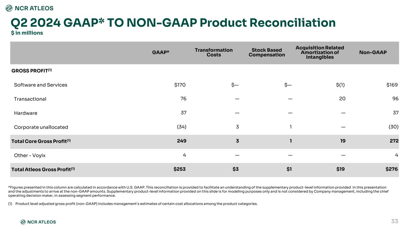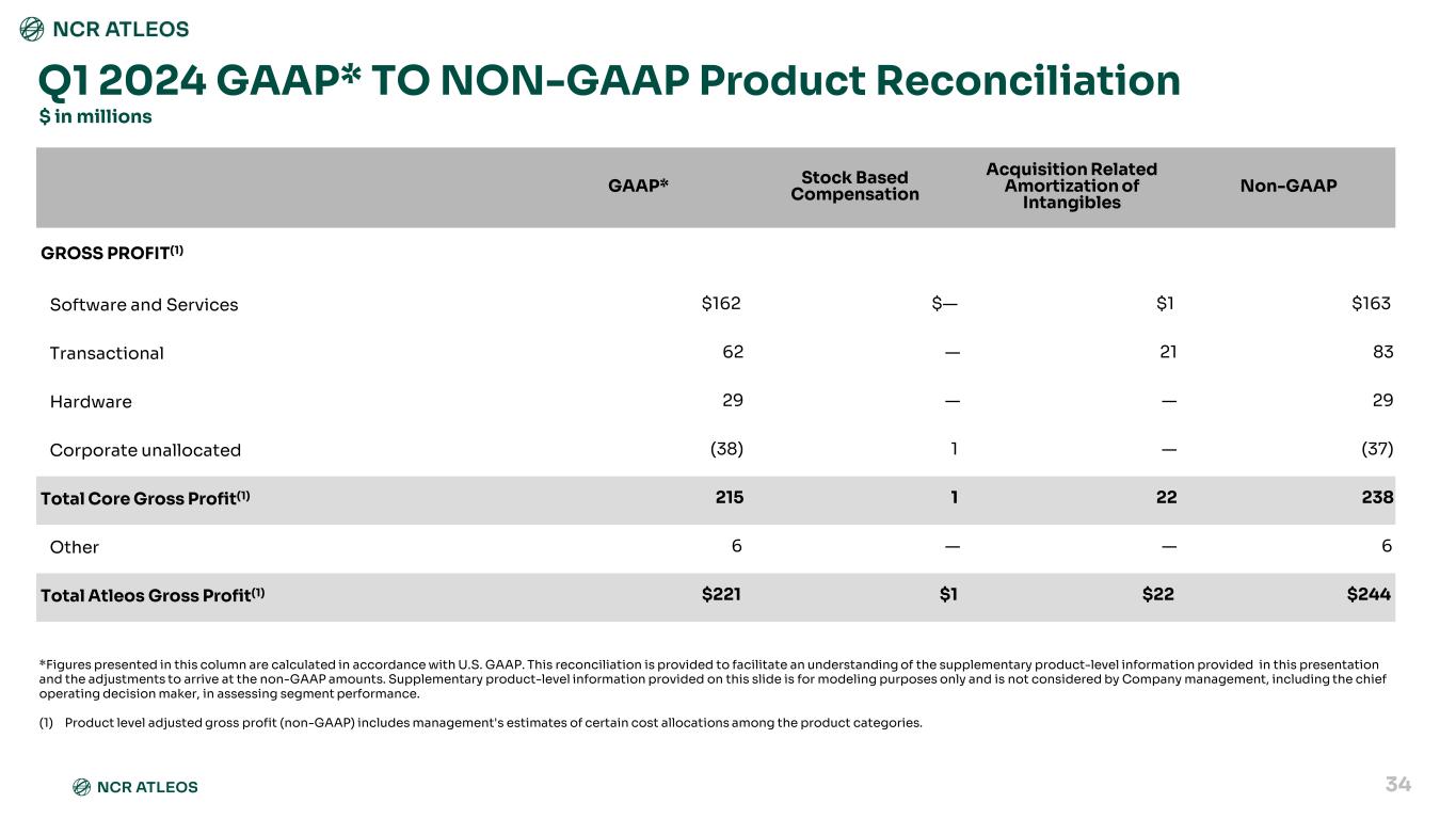 GAAP* Transformation Costs Stock Based Compensation Acquisition Related Amortization of Intangibles Non-GAAP GROSS PROFIT(1) Software and Services $170 $— $— $(1) $169 Transactional 76 — — 20 96 Hardware 37 — — — 37 Corporate unallocated (34) 3 1 — (30) Total Core Gross Profit(1) 249 3 1 19 272 Other - Voyix 4 — — — 4 Total Atleos Gross Profit(1) $253 $3 $1 $19 $276 Q2 2024 GAAP* TO NON-GAAP Product Reconciliation $ in millions 33 *Figures presented in this column are calculated in accordance with U.S. GAAP. This reconciliation is provided to facilitate an understanding of the supplementary product-level information provided in this presentation and the adjustments to arrive at the non-GAAP amounts. Supplementary product-level information provided on this slide is for modeling purposes only and is not considered by Company management, including the chief operating decision maker, in assessing segment performance. (1) Product level adjusted gross profit (non-GAAP) includes management's estimates of certain cost allocations among the product categories.