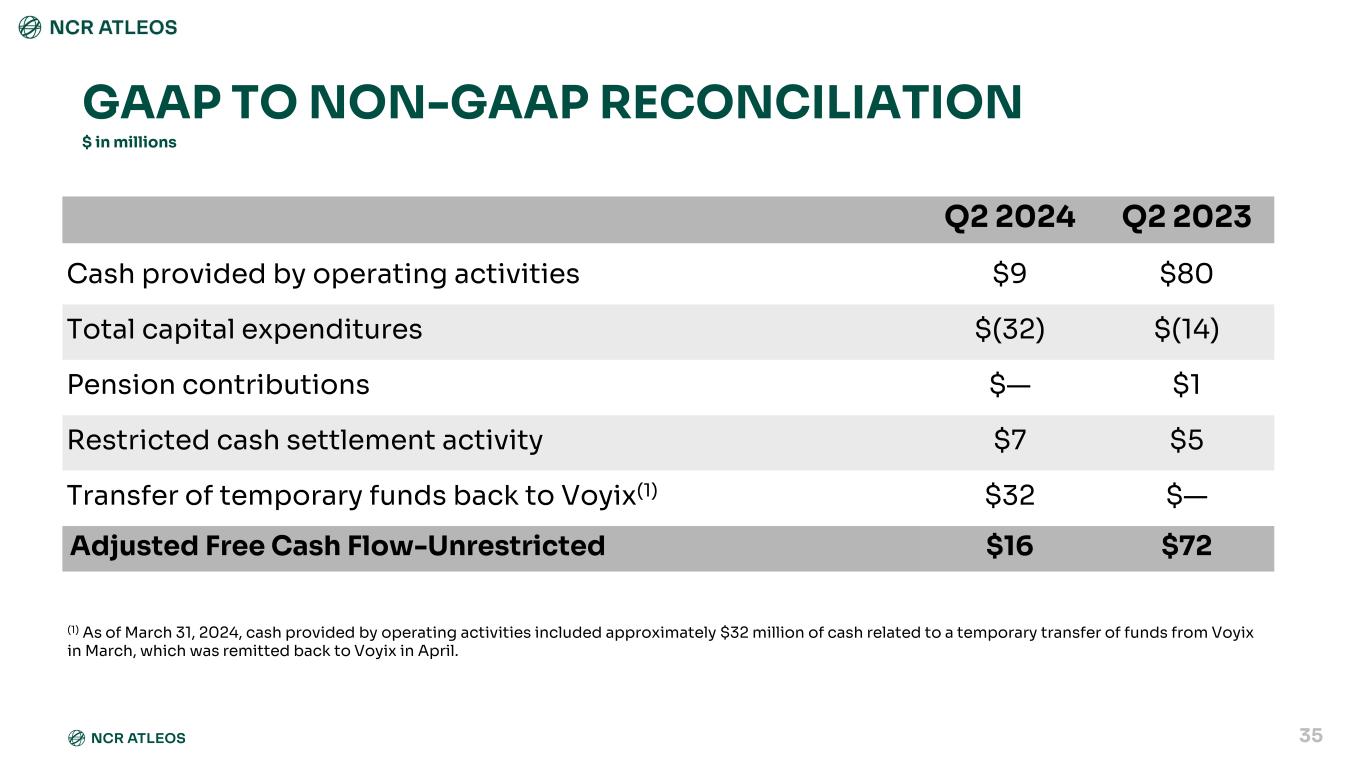 Q2 2024 Q2 2023 Cash provided by operating activities $9 $80 Total capital expenditures $(32) $(14) Pension contributions $— $1 Restricted cash settlement activity $7 $5 Transfer of temporary funds back to Voyix(1) $32 $— Adjusted Free Cash Flow-Unrestricted $16 $72 $ in millions GAAP TO NON-GAAP RECONCILIATION 35 (1) As of March 31, 2024, cash provided by operating activities included approximately $32 million of cash related to a temporary transfer of funds from Voyix in March, which was remitted back to Voyix in April.