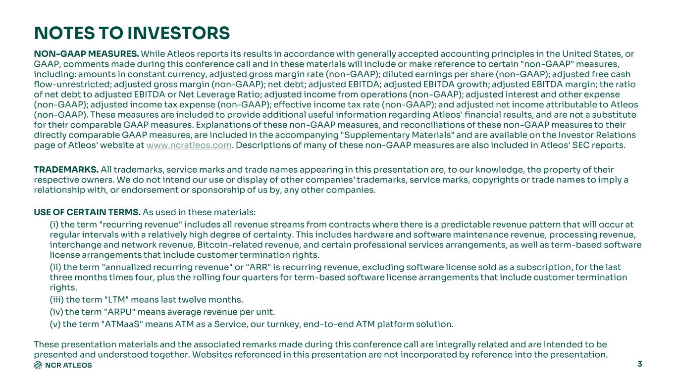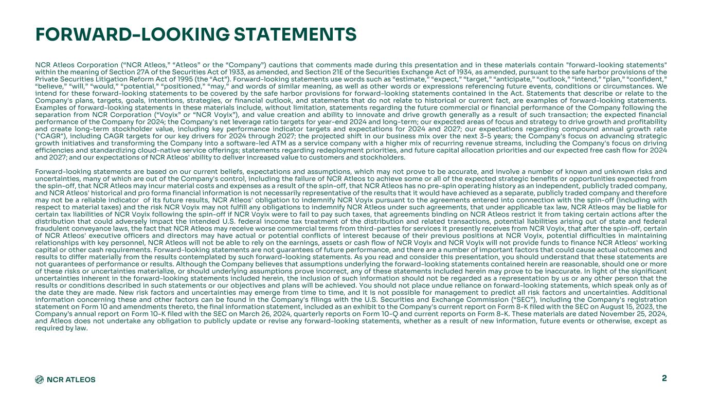 FORWARD-LOOKING STATEMENTS 2 NCR Atleos Corporation (“NCR Atleos,” “Atleos” or the “Company”) cautions that comments made during this presentation and in these materials contain "forward-looking statements" within the meaning of Section 27A of the Securities Act of 1933, as amended, and Section 21E of the Securities Exchange Act of 1934, as amended, pursuant to the safe harbor provisions of the Private Securities Litigation Reform Act of 1995 (the “Act”). Forward-looking statements use words such as “estimate,” “expect,” “target,” “anticipate,” “outlook,” “intend,” “plan,” “confident,” “believe,” “will,” “would,” “potential,” “positioned,” “may,” and words of similar meaning, as well as other words or expressions referencing future events, conditions or circumstances. We intend for these forward-looking statements to be covered by the safe harbor provisions for forward-looking statements contained in the Act. Statements that describe or relate to the Company's plans, targets, goals, intentions, strategies, or financial outlook, and statements that do not relate to historical or current fact, are examples of forward-looking statements. Examples of forward-looking statements in these materials include, without limitation, statements regarding the future commercial or financial performance of the Company following the separation from NCR Corporation (“Voyix” or “NCR Voyix”), and value creation and ability to innovate and drive growth generally as a result of such transaction; the expected financial performance of the Company for 2024; the Company's net leverage ratio targets for year-end 2024 and long-term; our expected areas of focus and strategy to drive growth and profitability and create long-term stockholder value, including key performance indicator targets and expectations for 2024 and 2027; our expectations regarding compound annual growth rate ("CAGR"), including CAGR targets for our key drivers for 2024 through 2027; the projected shift in our business mix over the next 3-5 years; the Company's focus on advancing strategic growth initiatives and transforming the Company into a software-led ATM as a service company with a higher mix of recurring revenue streams, including the Company's focus on driving efficiencies and standardizing cloud-native service offerings; statements regarding redeployment priorities, and future capital allocation priorities and our expected free cash flow for 2024 and 2027; and our expectations of NCR Atleos' ability to deliver increased value to customers and stockholders. Forward-looking statements are based on our current beliefs, expectations and assumptions, which may not prove to be accurate, and involve a number of known and unknown risks and uncertainties, many of which are out of the Company's control, including the failure of NCR Atleos to achieve some or all of the expected strategic benefits or opportunities expected from the spin-off, that NCR Atleos may incur material costs and expenses as a result of the spin-off, that NCR Atleos has no pre-spin operating history as an independent, publicly traded company, and NCR Atleos' historical and pro forma financial information is not necessarily representative of the results that it would have achieved as a separate, publicly traded company and therefore may not be a reliable indicator of its future results, NCR Atleos' obligation to indemnify NCR Voyix pursuant to the agreements entered into connection with the spin-off (including with respect to material taxes) and the risk NCR Voyix may not fulfill any obligations to indemnify NCR Atleos under such agreements, that under applicable tax law, NCR Atleos may be liable for certain tax liabilities of NCR Voyix following the spin-off if NCR Voyix were to fail to pay such taxes, that agreements binding on NCR Atleos restrict it from taking certain actions after the distribution that could adversely impact the intended U.S. federal income tax treatment of the distribution and related transactions, potential liabilities arising out of state and federal fraudulent conveyance laws, the fact that NCR Atleos may receive worse commercial terms from third-parties for services it presently receives from NCR Voyix, that after the spin-off, certain of NCR Atleos' executive officers and directors may have actual or potential conflicts of interest because of their previous positions at NCR Voyix, potential difficulties in maintaining relationships with key personnel, NCR Atleos will not be able to rely on the earnings, assets or cash flow of NCR Voyix and NCR Voyix will not provide funds to finance NCR Atleos' working capital or other cash requirements. Forward-looking statements are not guarantees of future performance, and there are a number of important factors that could cause actual outcomes and results to differ materially from the results contemplated by such forward-looking statements. As you read and consider this presentation, you should understand that these statements are not guarantees of performance or results. Although the Company believes that assumptions underlying the forward-looking statements contained herein are reasonable, should one or more of these risks or uncertainties materialize, or should underlying assumptions prove incorrect, any of these statements included herein may prove to be inaccurate. In light of the significant uncertainties inherent in the forward-looking statements included herein, the inclusion of such information should not be regarded as a representation by us or any other person that the results or conditions described in such statements or our objectives and plans will be achieved. You should not place undue reliance on forward-looking statements, which speak only as of the date they are made. New risk factors and uncertainties may emerge from time to time, and it is not possible for management to predict all risk factors and uncertainties. A