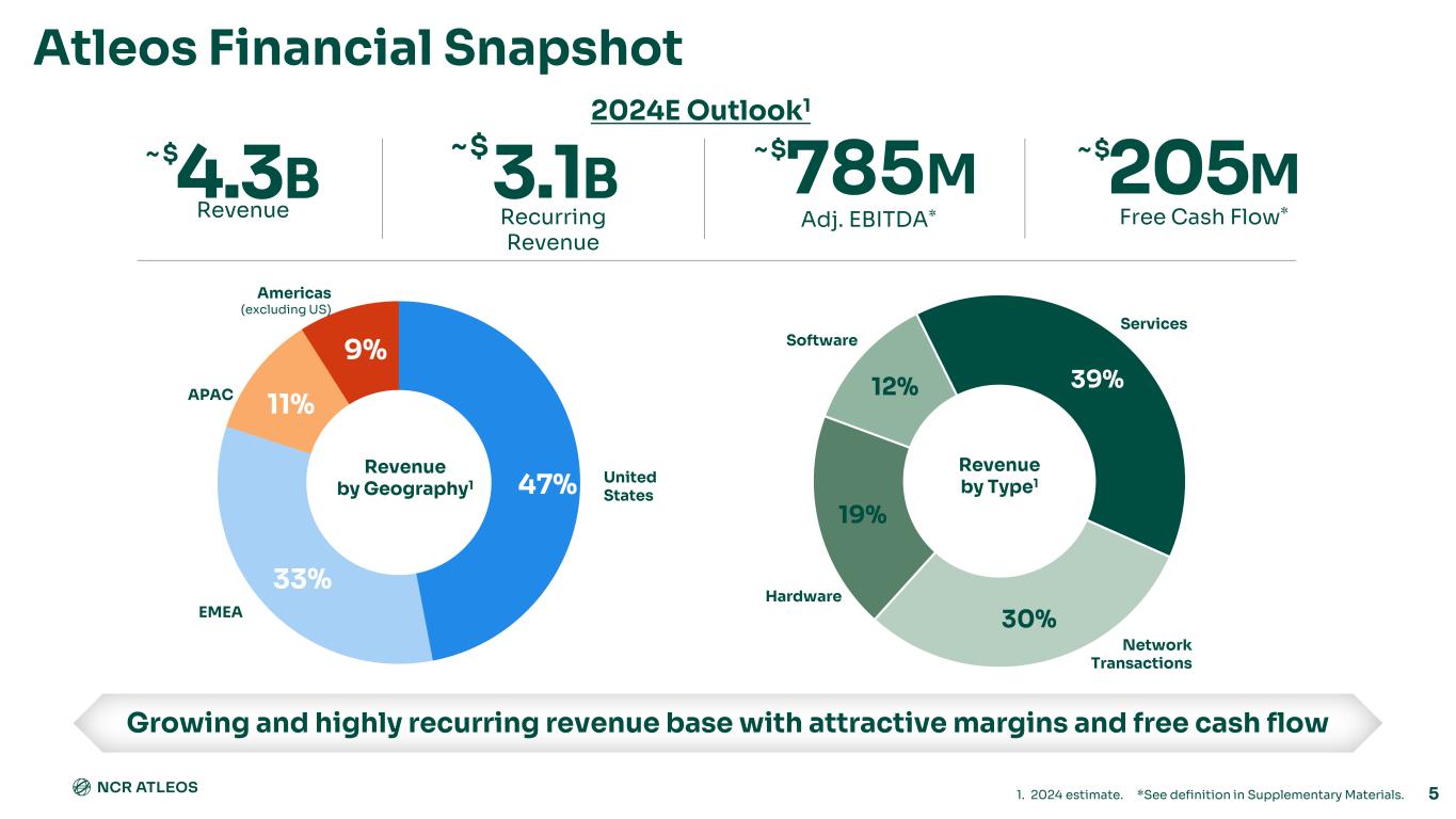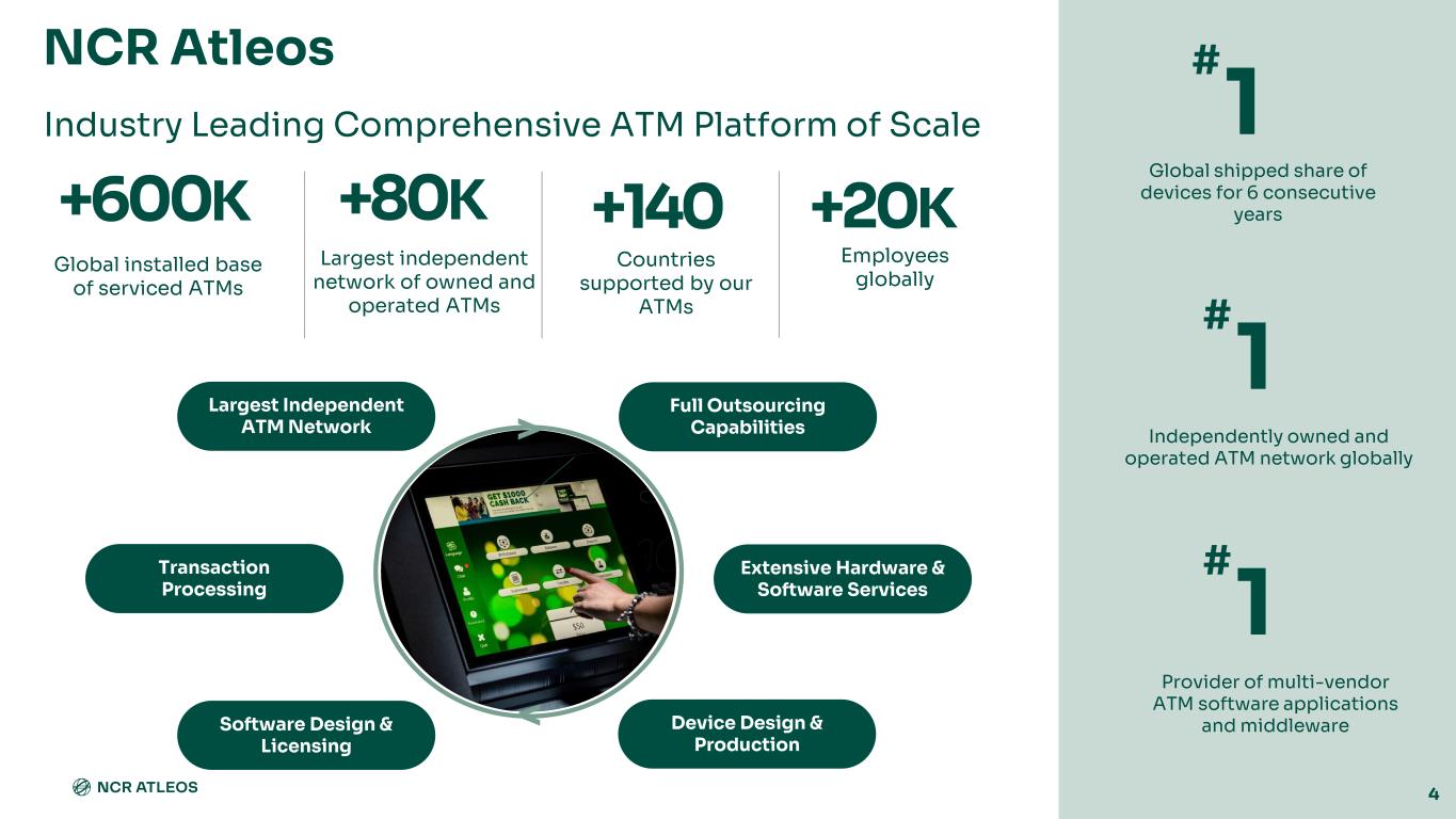 NOTES TO INVESTORS NON-GAAP MEASURES. While Atleos reports its results in accordance with generally accepted accounting principles in the United States, or GAAP, comments made during this conference call and in these materials will include or make reference to certain "non-GAAP" measures, including: amounts in constant currency, adjusted gross margin rate (non-GAAP); diluted earnings per share (non-GAAP); adjusted free cash flow-unrestricted; adjusted gross margin (non-GAAP); net debt; adjusted EBITDA; adjusted EBITDA growth; adjusted EBITDA margin; the ratio of net debt to adjusted EBITDA or Net Leverage Ratio; adjusted income from operations (non-GAAP); adjusted interest and other expense (non-GAAP); adjusted income tax expense (non-GAAP); effective income tax rate (non-GAAP); and adjusted net income attributable to Atleos (non-GAAP). These measures are included to provide additional useful information regarding Atleos' financial results, and are not a substitute for their comparable GAAP measures. Explanations of these non-GAAP measures, and reconciliations of these non-GAAP measures to their directly comparable GAAP measures, are included in the accompanying "Supplementary Materials" and are available on the Investor Relations page of Atleos' website at www.ncratleos.com. Descriptions of many of these non-GAAP measures are also included in Atleos' SEC reports. TRADEMARKS. All trademarks, service marks and trade names appearing in this presentation are, to our knowledge, the property of their respective owners. We do not intend our use or display of other companies’ trademarks, service marks, copyrights or trade names to imply a relationship with, or endorsement or sponsorship of us by, any other companies. USE OF CERTAIN TERMS. As used in these materials: (i) the term "recurring revenue" includes all revenue streams from contracts where there is a predictable revenue pattern that will occur at regular intervals with a relatively high degree of certainty. This includes hardware and software maintenance revenue, processing revenue, interchange and network revenue, Bitcoin-related revenue, and certain professional services arrangements, as well as term-based software license arrangements that include customer termination rights. (ii) the term "annualized recurring revenue" or "ARR" is recurring revenue, excluding software license sold as a subscription, for the last three months times four, plus the rolling four quarters for term-based software license arrangements that include customer termination rights. (iii) the term "LTM" means last twelve months. (iv) the term "ARPU" means average revenue per unit. (v) the term "ATMaaS" means ATM as a Service, our turnkey, end-to-end ATM platform solution. These presentation materials and the associated remarks made during this conference call are integrally related and are intended to be presented and understood together. Websites referenced in this presentation are not incorporated by reference into the presentation. 3