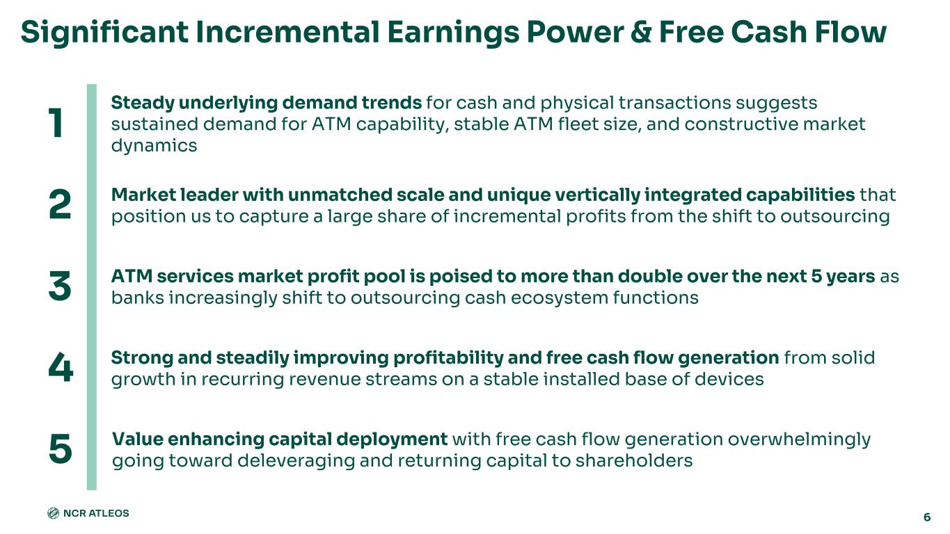 4NCR Atleos Confidential NCR Atleos Industry Leading Comprehensive ATM Platform of Scale # 1 Independently owned and operated ATM network globally # 1 Provider of multi-vendor ATM software applications and middleware +600K Global installed base of serviced ATMs +80K Largest independent network of owned and operated ATMs +140 Countries supported by our ATMs 4 # 1 Global shipped share of devices for 6 consecutive years+20K Employees globally Largest Independent ATM Network v v Device Design & Production Transaction Processing Software Design & Licensing Full Outsourcing Capabilities Extensive Hardware & Software Services