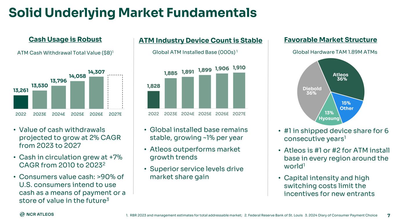 6 1 Steady underlying demand trends for cash and physical transactions suggests sustained demand for ATM capability, stable ATM fleet size, and constructive market dynamics 2 Market leader with unmatched scale and unique vertically integrated capabilities that position us to capture a large share of incremental profits from the shift to outsourcing 3 ATM services market profit pool is poised to more than double over the next 5 years as banks increasingly shift to outsourcing cash ecosystem functions 4 Strong and steadily improving profitability and free cash flow generation from solid growth in recurring revenue streams on a stable installed base of devices 5 Value enhancing capital deployment with free cash flow generation overwhelmingly going toward deleveraging and returning capital to shareholders Significant Incremental Earnings Power & Free Cash Flow