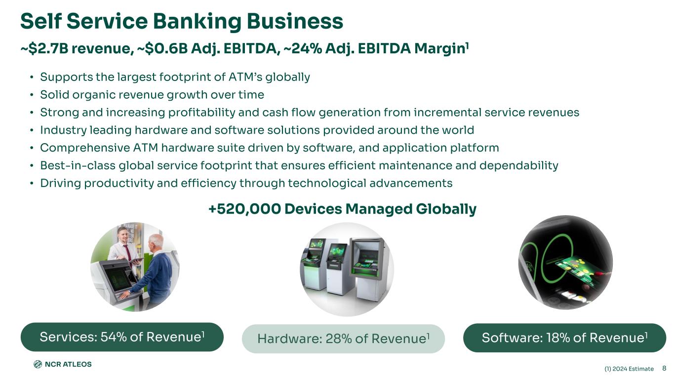 7 Solid Underlying Market Fundamentals Cash Usage is Robust ATM Industry Device Count is Stable ATM Cash Withdrawal Total Value ($B)1 Global ATM Installed Base (000s) 1 1. RBR 2023 and management estimates for total addressable market; 2. Federal Reserve Bank of St. Louis 3. 2024 Diary of Consumer Payment Choice • Global installed base remains stable, growing ~1% per year • Atleos outperforms market growth trends • Superior service levels drive market share gain • Value of cash withdrawals projected to grow at 2% CAGR from 2023 to 2027 • Cash in circulation grew at +7% CAGR from 2010 to 20232 • Consumers value cash: >90% of U.S. consumers intend to use cash as a means of payment or a store of value in the future3 13,261 13,530 13,796 14,058 14,307 2022 2023E 2024E 2025E 2026E 2027E 1,828 1,885 1,891 1,899 1,906 1,910 2022 2023E 2024E 2025E 2026E 2027E Favorable Market Structure Global Hardware TAM 1.89M ATMs 36% 36% 15% 13% Atleos Diebold Hyosung • #1 in shipped device share for 6 consecutive years1 • Atleos is #1 or #2 for ATM install base in every region around the world1 • Capital intensity and high switching costs limit the incentives for new entrants Other